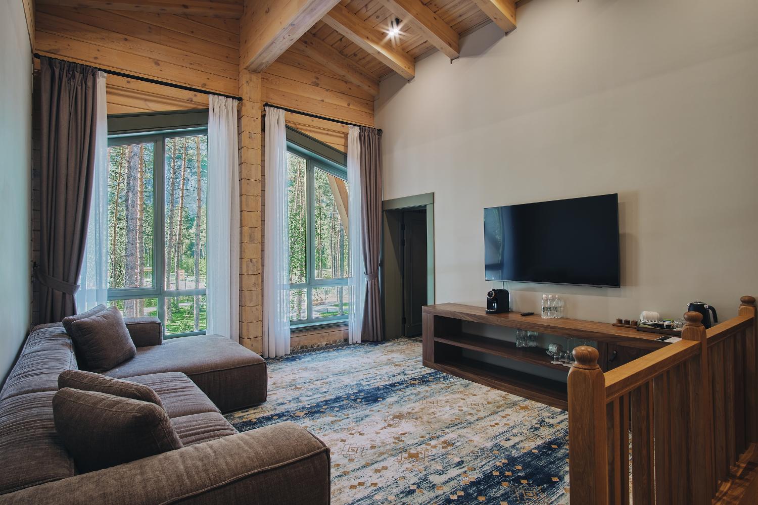 Our two-story Premium Suite with two bedrooms and a cozy living room is an ideal choice for a family holiday on the banks of the Katun River.