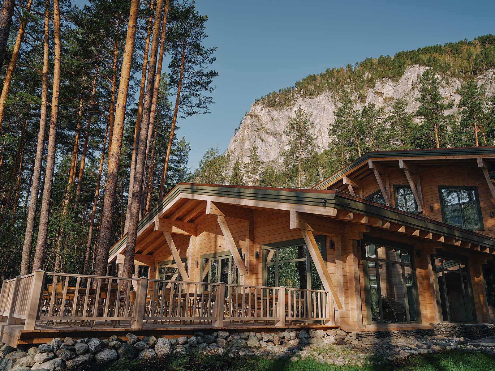 Grand Chalet Altay is a first-class five-star resort in the Altai region, located in a beautiful location known as “Turquoise Katun”, close to the Tavdinsky Caves and the magnificent Katun River. It is an ideal location for those who want to enjoy the beauty of the Altai Mountains and at the same time be conveniently accessible from Gorno-Altaisk Airport just 30 minutes away. The resort occupies a huge area of 86,000 sq.m., covered with centuries-old pine trees and cozy walking paths.