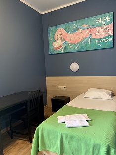 Имеется 1 кровать и 1 тумбочка. Есть стол, стул, шкафчик. Два душа и два санузла на три номера. Комната уютная и компактная, подойдет для тех, кто путешествует без компании.