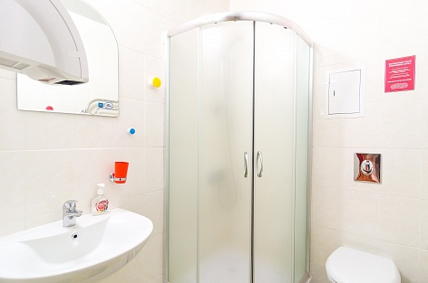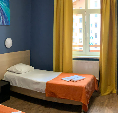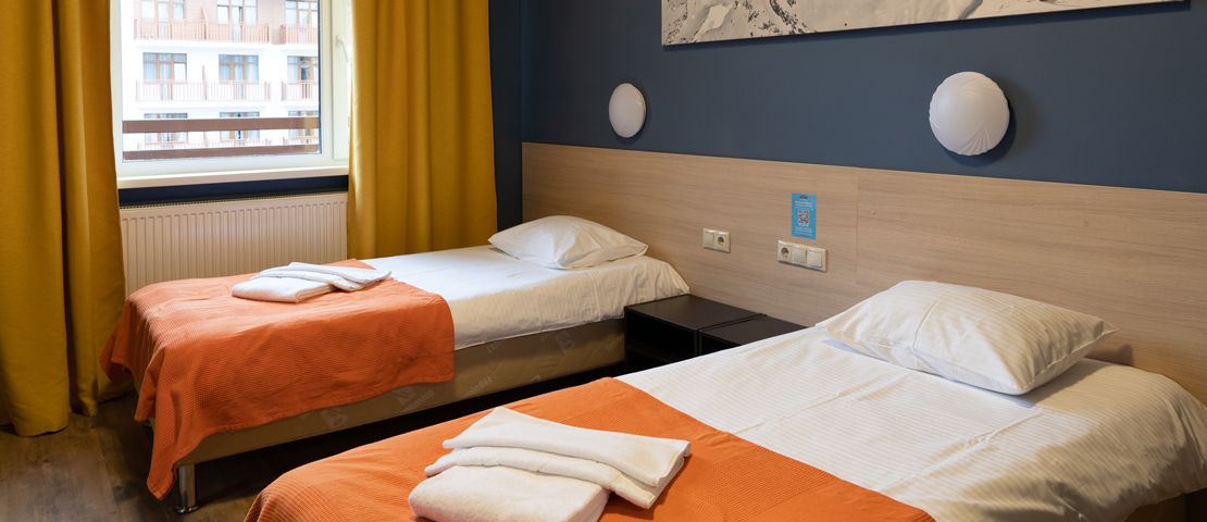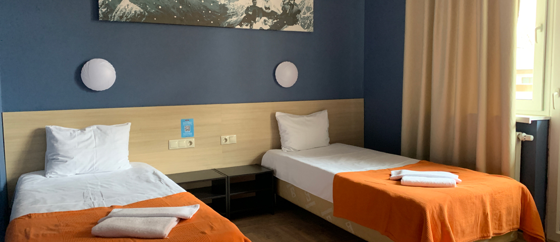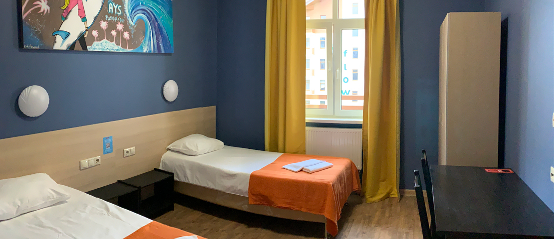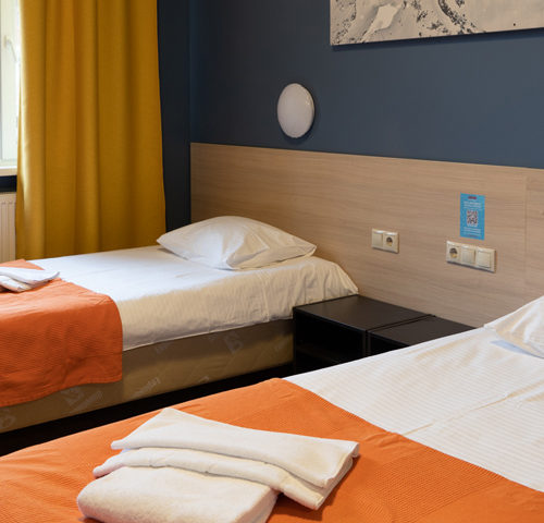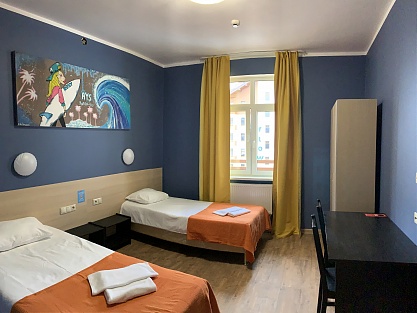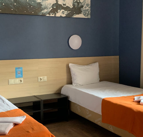 Есть две кровати и две тумбочки. Присутствует вся необходимая мебель для комфортного пребывания. В шкаф можно складывать и вешать одежду. Общий душ и санузел.