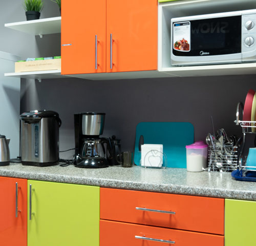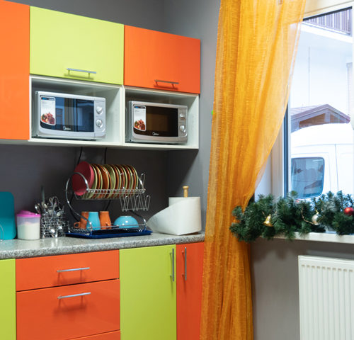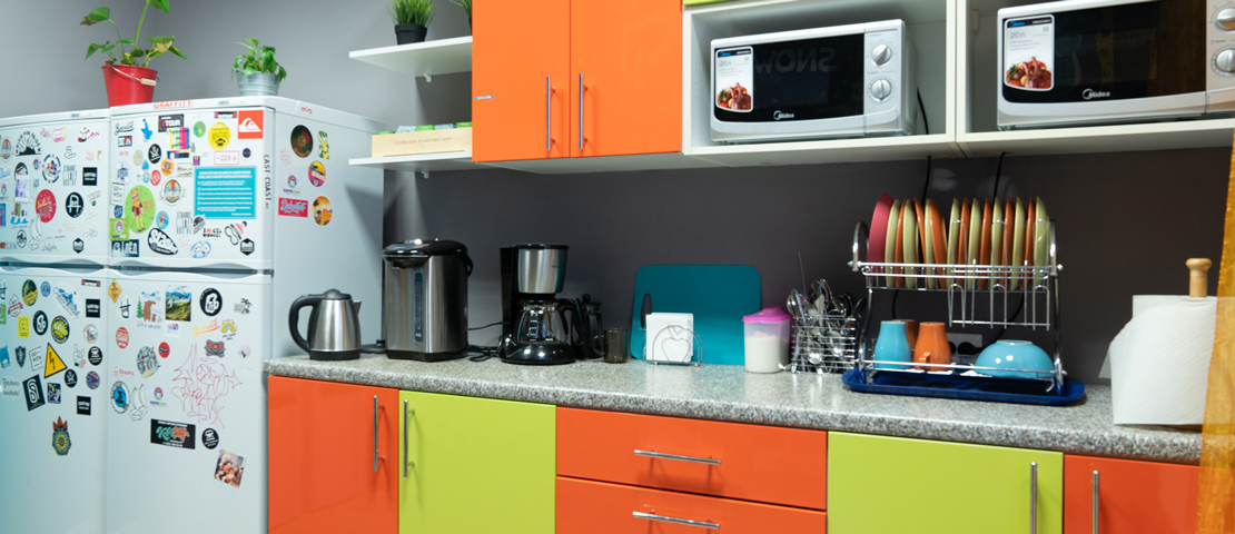 - Общая зона приема пищи с чайником, микроволновкой и холодильником