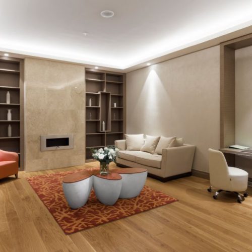 Номер с 2-мя спальнями, личной террасой и бассейном располагается на 2-х этажах. Первый этаж: гостиная, приемная/переговорная, личный кабинет. Второй: вторая гостиная, главная спальня с джакузи, дополнительная спальня с ванной комнатой. Терраса с панорамным видом на горы и подогреваемым бассейном. Из всех окон номера — вид на горы. Общая площадь номера 300м2. В номере: тв, wi-fi, утюг, гладильная доска, фен, сейф, мини-холодильник.