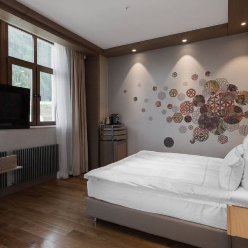Номер с 3-мя спальными располагается на 3-х этажах с прекрасным видом на горы. Первый этаж: гостиная, приемная/ переговорная, личный кабинет. Второй: вторая гостиная, главная спальня с джакузи, вторая спальня, комната для персонала/прислуги/охраны. Приватный выход. Небольшая терраса. В номере: тв, wi-fi, утюг, гладильная доска, фен, сейф, мини-холодильник. Общая площадь номера 336м2.