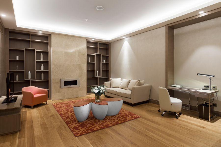 Номер представительского класса. Для ценителей простора и замечательного вида на горы. Общая площадь номера 118м2. Просторная гостиная: рабочий уголок, гостевая зона. В номере: тв, утюг, гладильная доска, фен, сейф, мини-холодильник. Небольшая приемная. Ванная комната: ванна, душевая кабина.