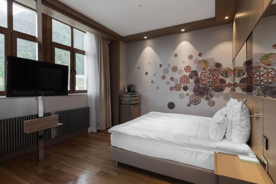 Номер с 3-мя спальными располагается на 3-х этажах с прекрасным видом на горы. Первый этаж: гостиная, приемная/ переговорная, личный кабинет. Второй: вторая гостиная, главная спальня с джакузи, вторая спальня, комната для персонала/прислуги/охраны. Приватный выход. Небольшая терраса. В номере: тв, wi-fi, утюг, гладильная доска, фен, сейф, мини-холодильник. Общая площадь номера 336м2.