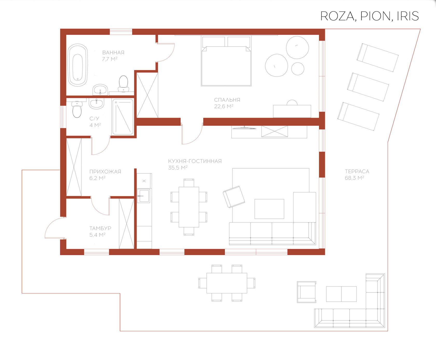 Коттедж площадью 130 кв.м. рассчитан на 4 гостей. 2 спальни с панорамными окнами и собственными балконами, общая терраса площадью 85 кв.м., 3 санузла, большие гардеробные (для каждой из спален и общая на первом этаже), кухня-гостиная с обеденной зоной и мягкой мебелью. Кухня оборудована микроволновой печью и чайником, есть вся необходимая посуда и столовые приборы. Кровати в спальных комнатах на выбор — double или twin. Есть телевизор, фен, мини-бар, бесплатный Wi-Fi.