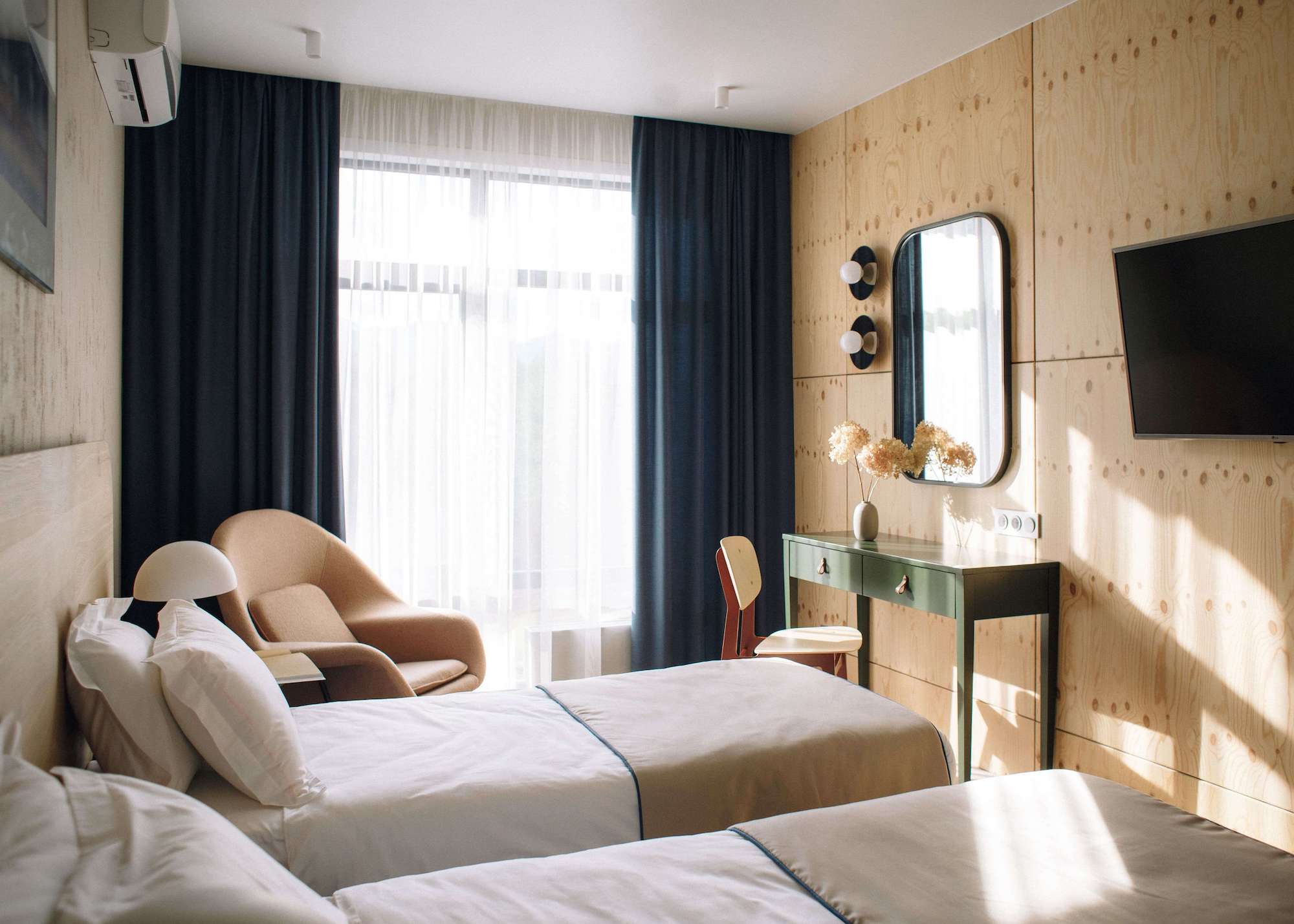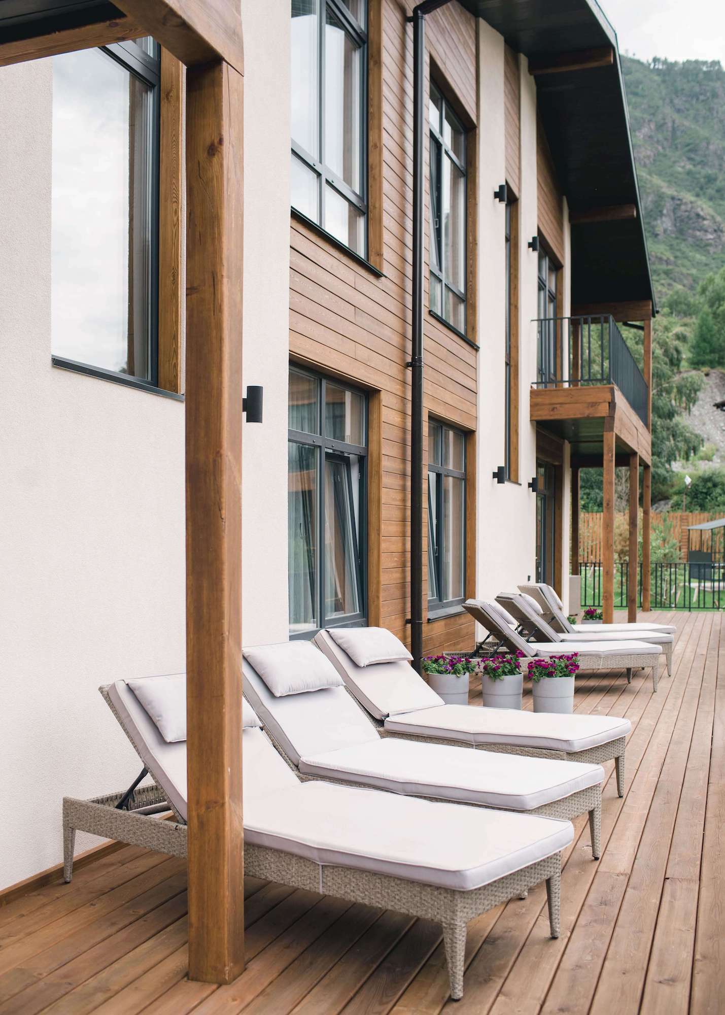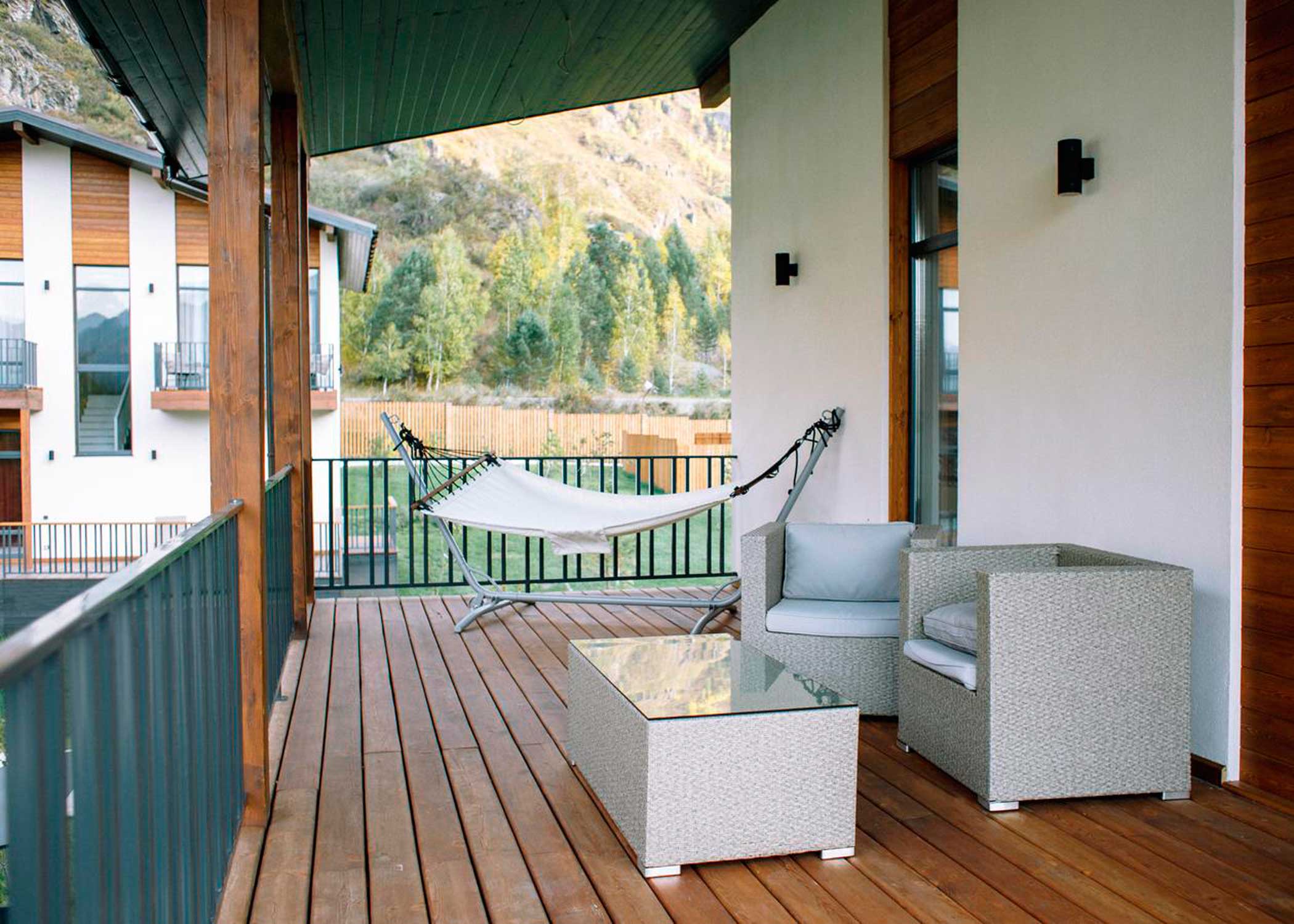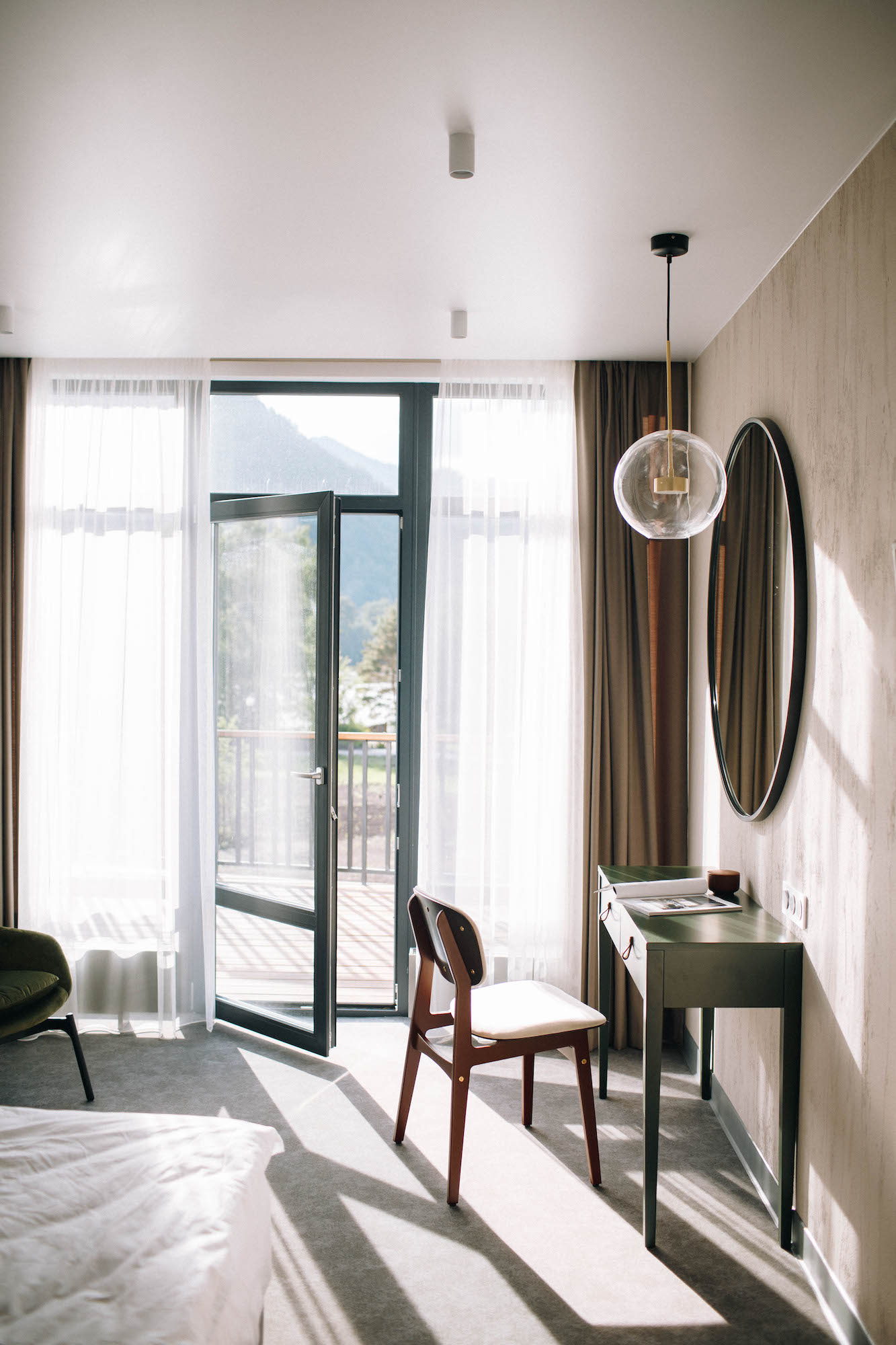 Двухместный номер площадью 35 кв.м. Расположен в двухэтажном корпусе с 18 номерами. Есть возможность взять дополнительное место. Кровати — double или twin, по запросу предоставляется детская кроватка. Комната оформлена в лаконичном эко-стиле. Помимо кровати, в комнате есть мягкая мебель и журнальный столик, прикроватные столики и стильные светильники. ВАнная комната с душевой кабиной оформлена в стиле лофт, в ней есть всё необходимое: полотенца, душевые принадлежности, фен. Также в каждом номере есть балкон со стульями и столиком, с видом на горы и реку.