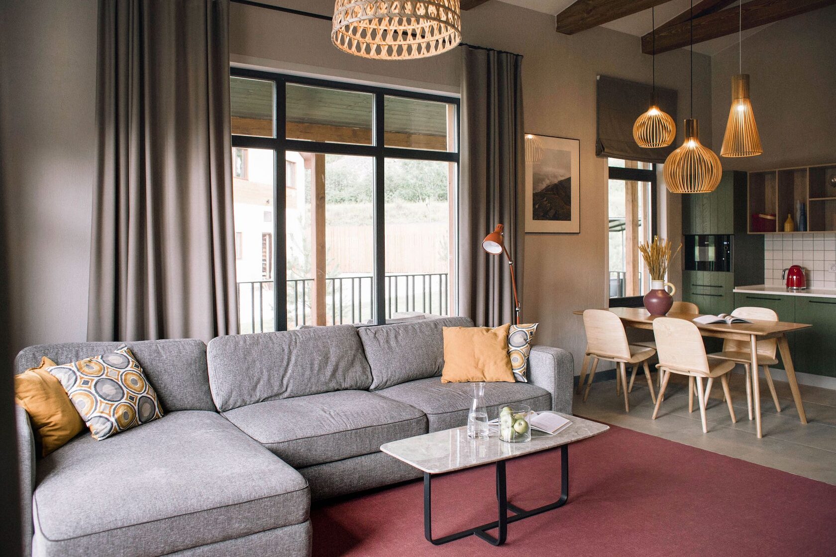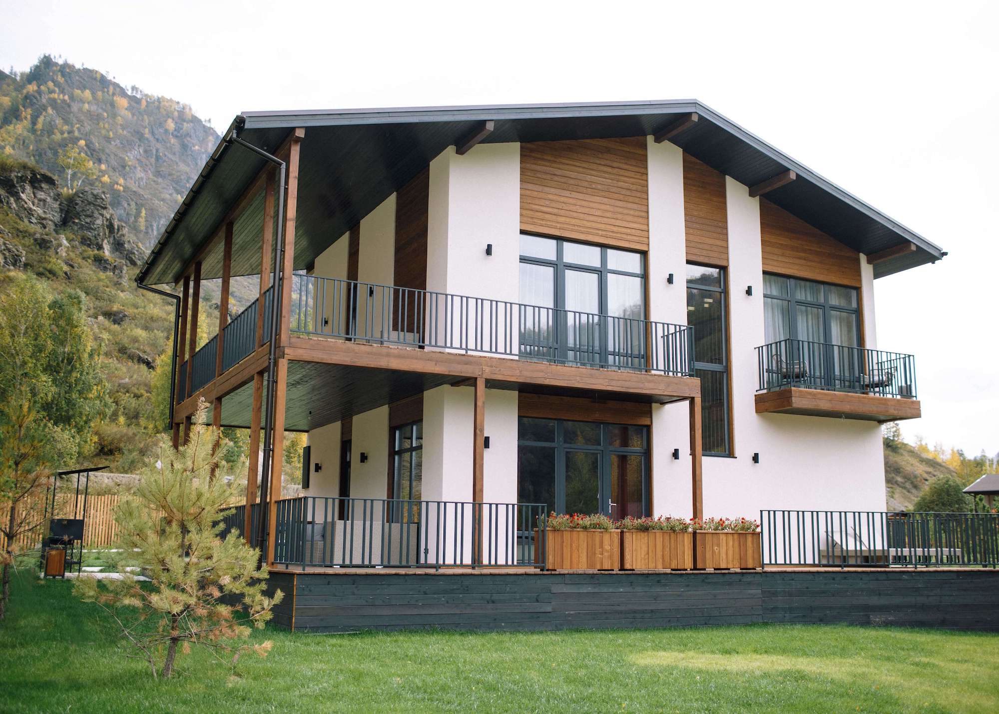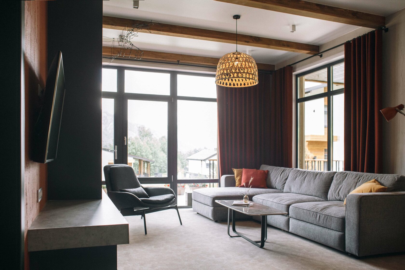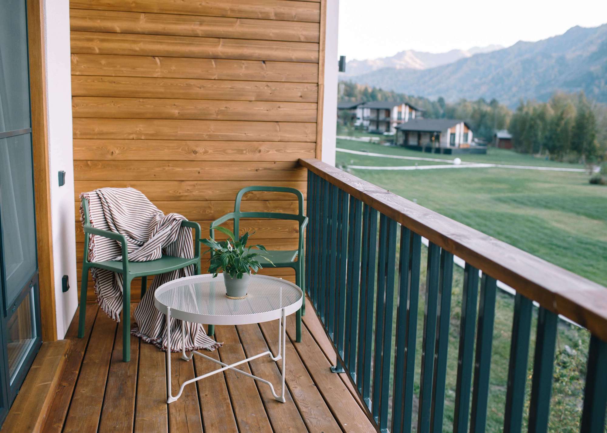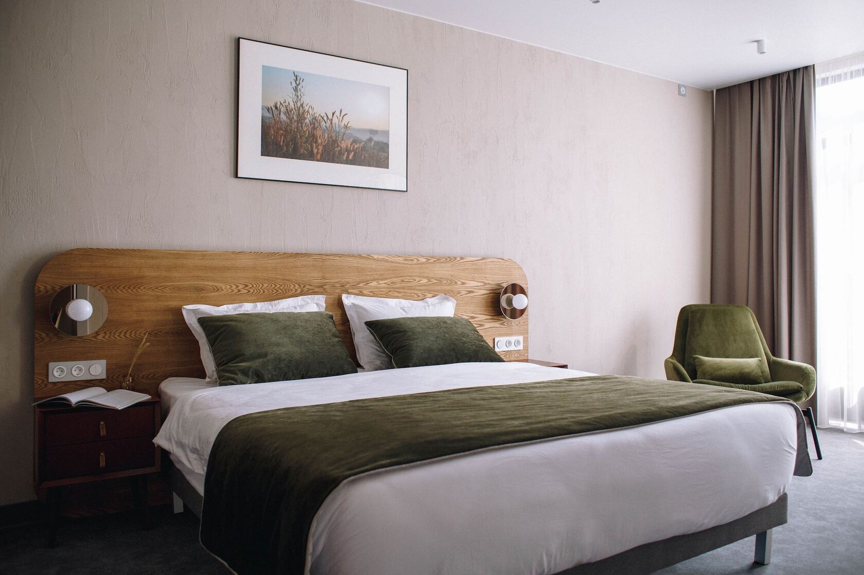 Двухместный номер площадью 35 кв.м. Расположен в двухэтажном корпусе с 18 номерами. Есть возможность взять дополнительное место. Кровати — double или twin, по запросу предоставляется детская кроватка. Комната оформлена в лаконичном эко-стиле. Помимо кровати, в комнате есть мягкая мебель и журнальный столик, прикроватные столики и стильные светильники. ВАнная комната с душевой кабиной оформлена в стиле лофт, в ней есть всё необходимое: полотенца, душевые принадлежности, фен. Также в каждом номере есть балкон со стульями и столиком, с видом на горы и реку.