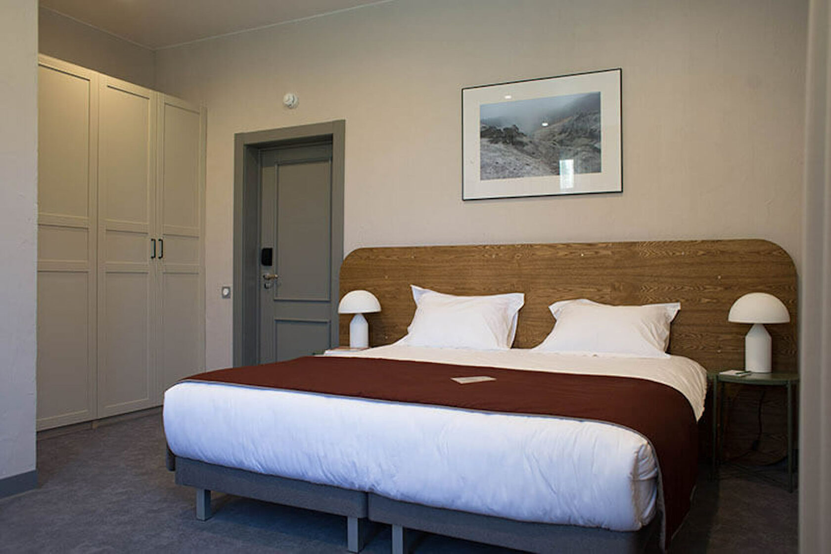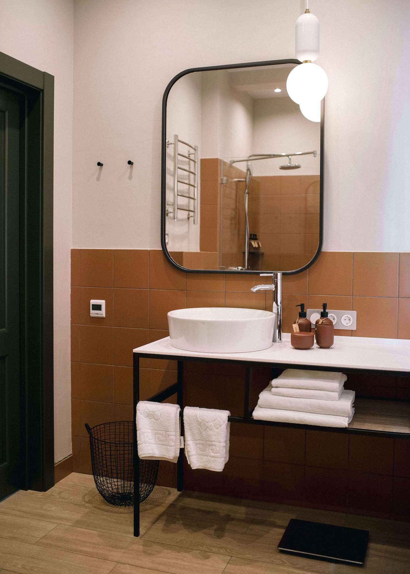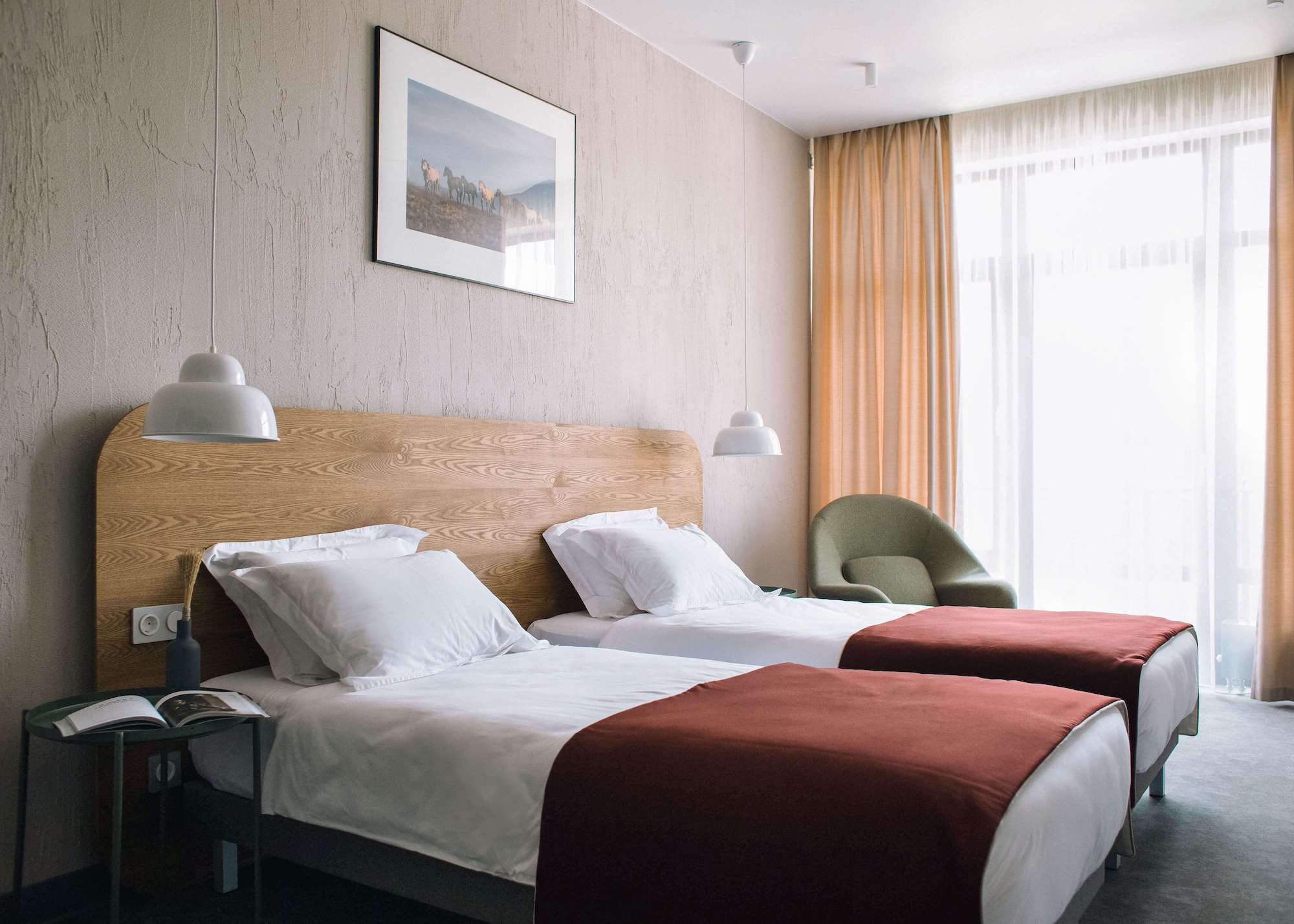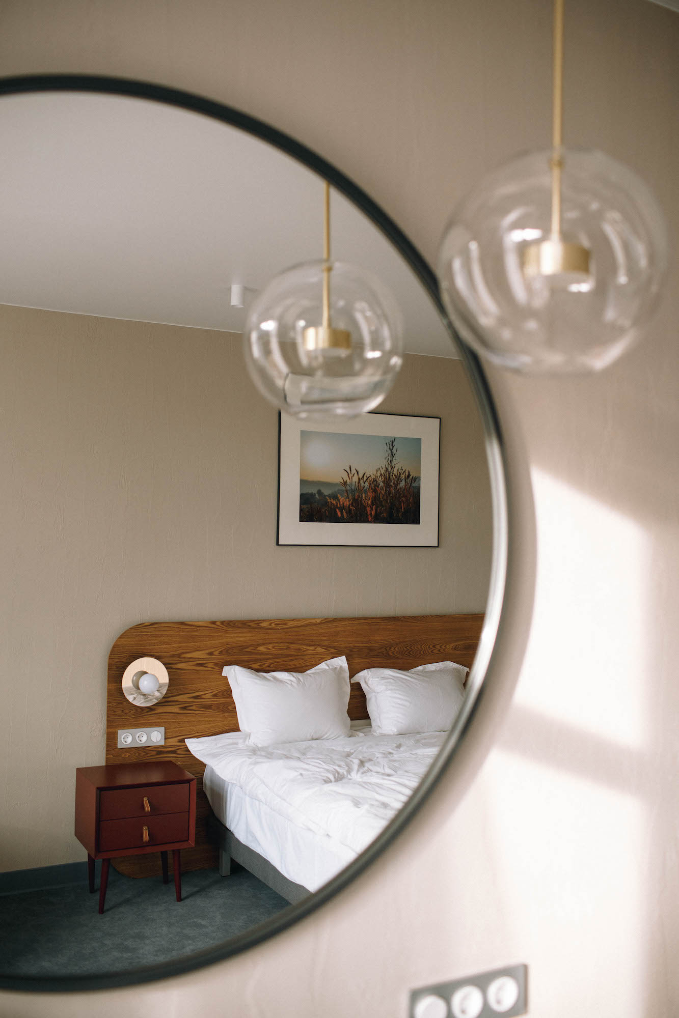 Двухместный номер площадью 35 кв.м. Расположен в двухэтажном корпусе с 18 номерами. Есть возможность взять дополнительное место. Кровати — double или twin, по запросу предоставляется детская кроватка. Комната оформлена в лаконичном эко-стиле. Помимо кровати, в комнате есть мягкая мебель и журнальный столик, прикроватные столики и стильные светильники. ВАнная комната с душевой кабиной оформлена в стиле лофт, в ней есть всё необходимое: полотенца, душевые принадлежности, фен. Также в каждом номере есть балкон со стульями и столиком, с видом на горы и реку.
