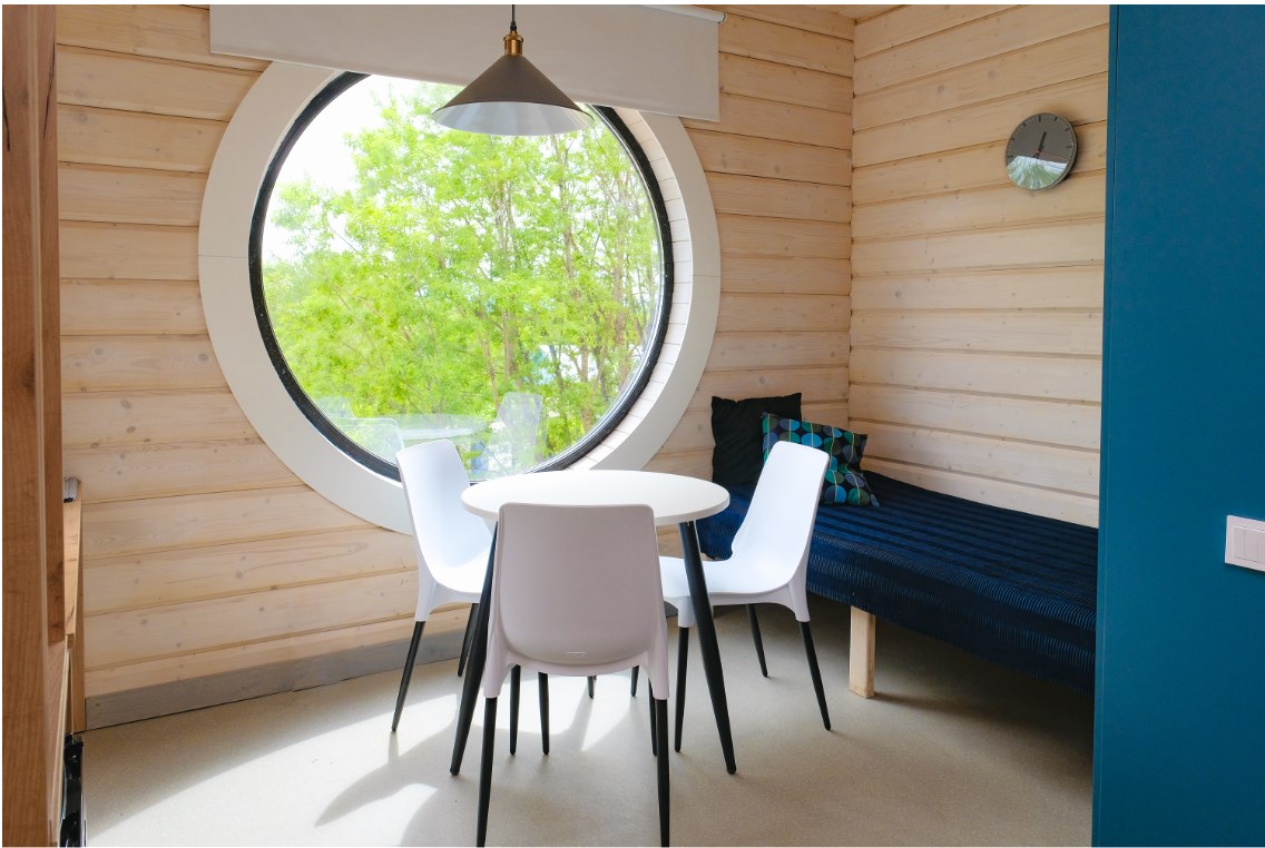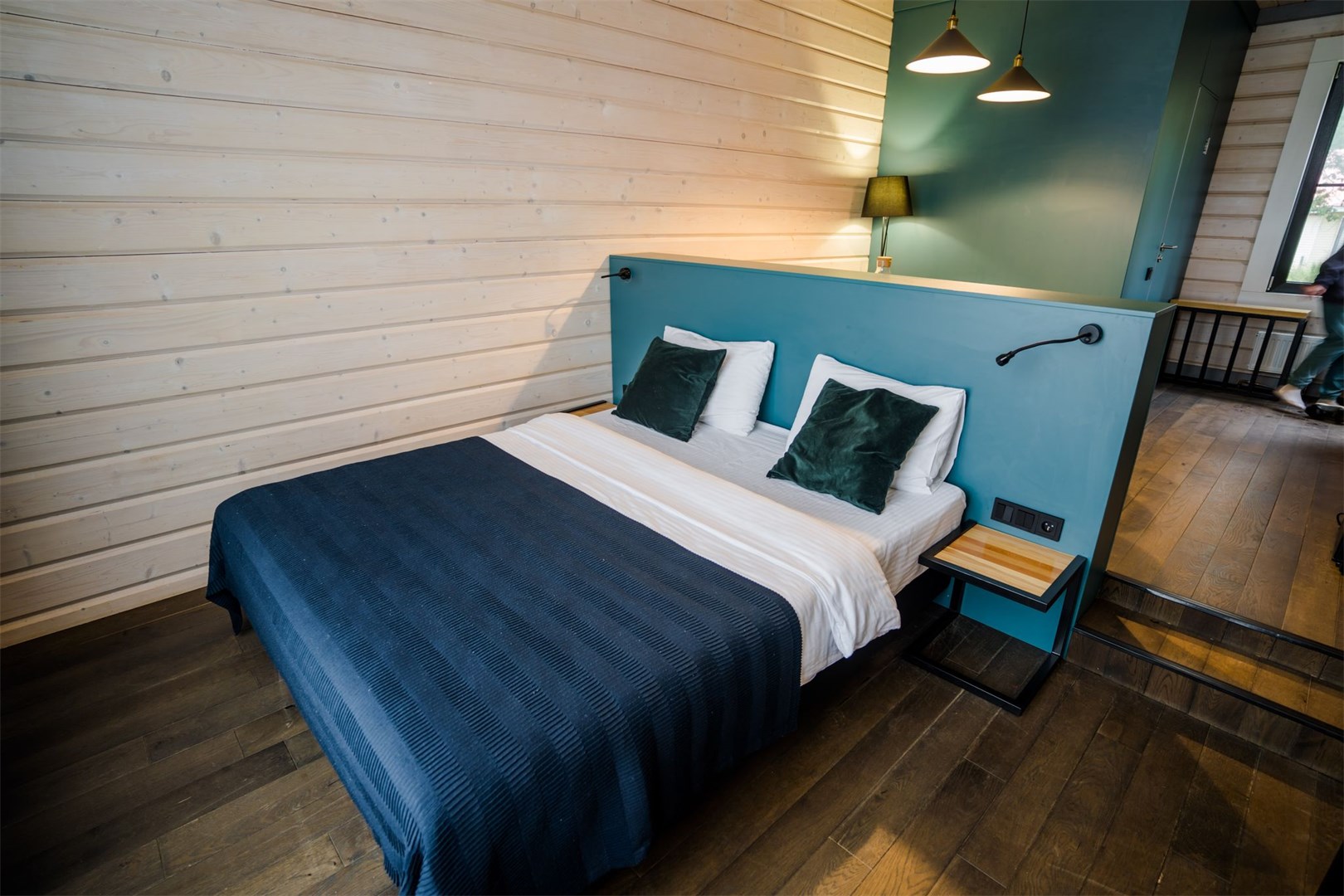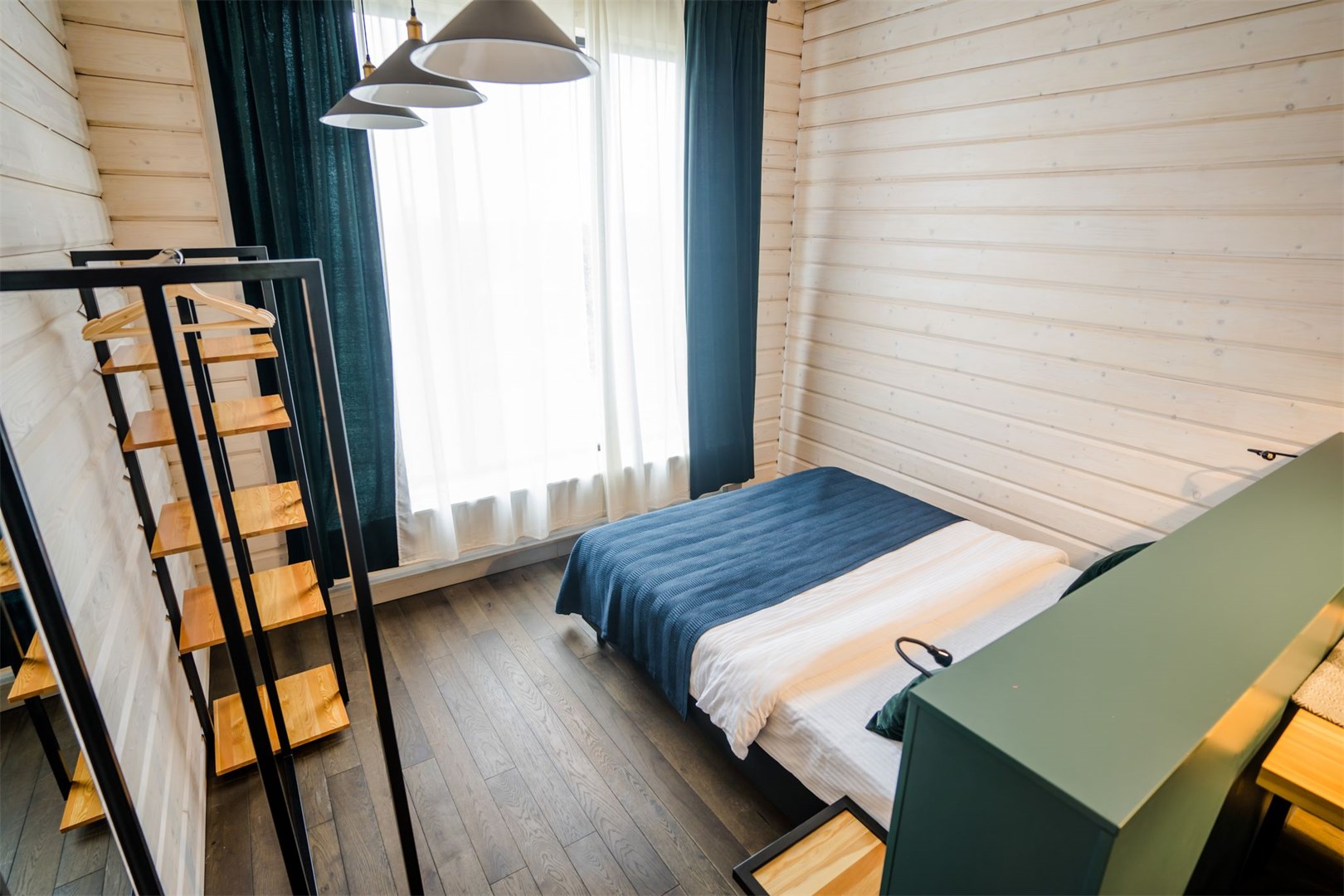 Возможно, самые узнаваемые строения «Лагуны» — дома с необычными окнами-иллюминаторами. Площадь одного номера — 24 кв.м., вместимость — 2-3 человека. Каждый два смежных номера объединены общей террасой и мангальной зоной с беседкой, поэтому такой вариант размещения подходит для больших компаний. В номерах, оформленном в современном эко-стиле — двуспальная кровать или две односпальные, раскладной диван, вместительная зона хранения, обеденная зона у окон с видом на лес, собственная ванная комната с душевой кабиной.