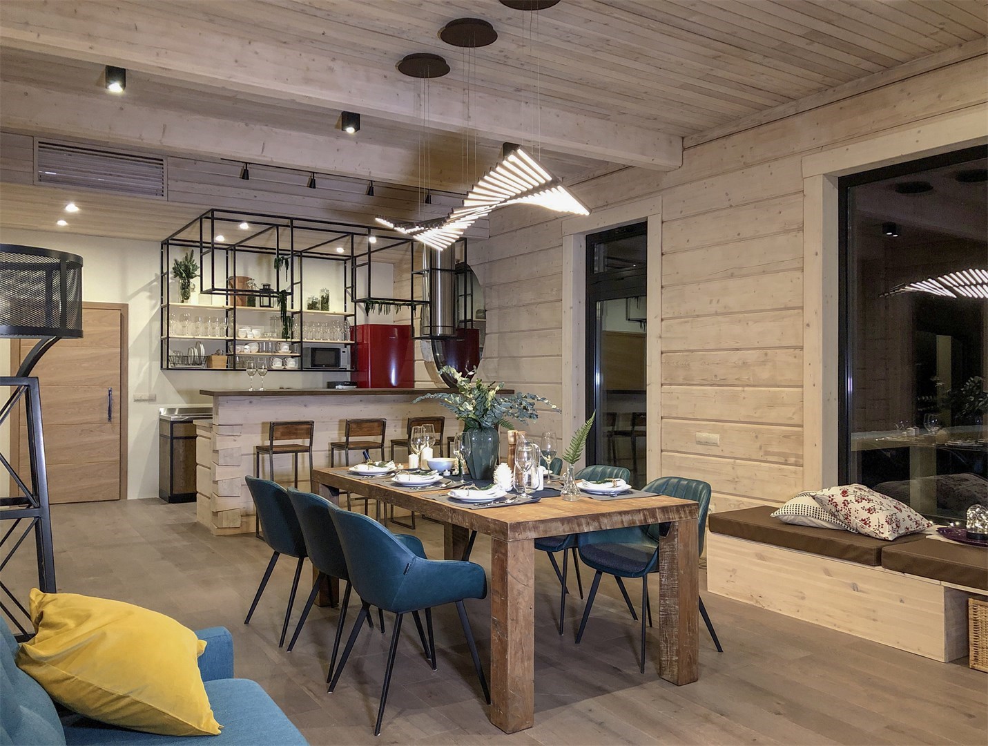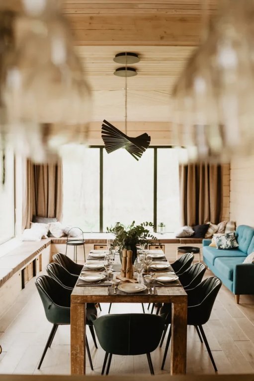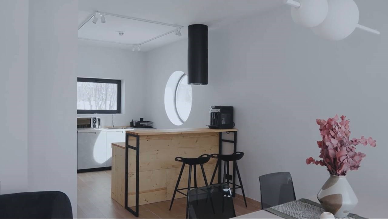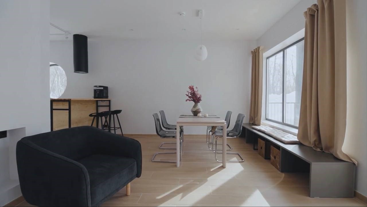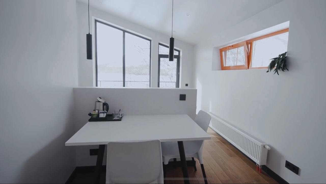 Площадь двухэтажного коттеджа — 100 кв.м. Эксклюзивное расположение: дом находится в уединенном месте, на берегу озера Микижа. В нем четыре спальных комнаты с двухместными кроватями и собственными ванными. Общая зона — одновременно и гостиная, и полностью укомплектованная кухня с обеденной зоной и небольшой барной стойкой. Для приготовления пищи можно пригласить местного шеф-повара. На террасе — собственная купель с термальной водой, в которой можно расслабиться в любое время года. Также есть собственная мангальная зона.