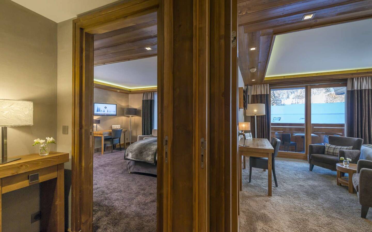 Улучшенный номер площадью 36-38 кв.м., с балконом, просторной гостиной зоной и вместительным гардеробом. Из окна видны горы. В санузле — ванная и душевая кабина, туалетно-косметические принадлежности. Гости отдельно отмечают удобные кровати: после дня, проведенного на склонах, сон на них будет очень крепким!