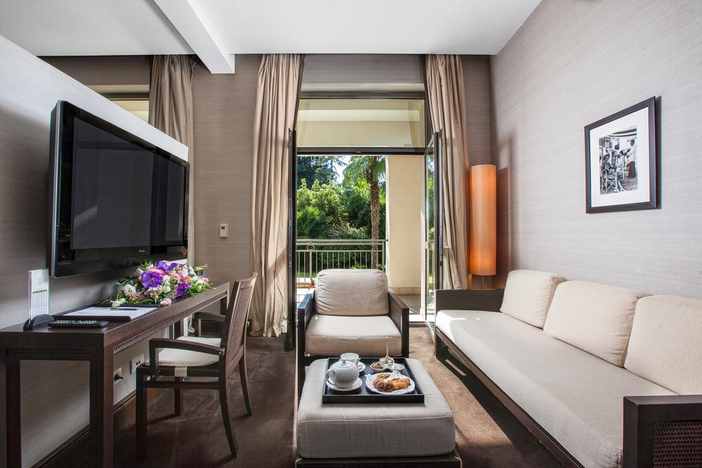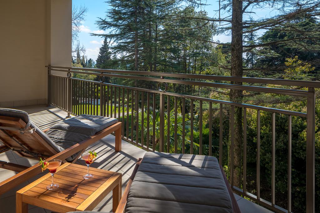 Большая 1 двуспальная кровать. Есть кондиционер, ТВ с плоским экраном, мини-бар. В ванной комнате лежат основные косметические средства. С балкона открывается вид на сад.
