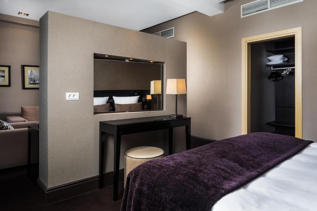 Широкое спальное место. Есть гостиная область и кабинет. Из зала округлой формы открывается вид на море и парк. Душ с гидромассажем.