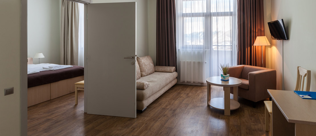 Стильный и уютный номер имеет две спальни. Общая площадь составляет 60-63 кв.м. Есть мягкая мебель, холодильник, электрический чайник. На большом плоском телевизоре можно смотреть фильмы. Присутствует прихожая, чистый санузел, душ. Каждая спальня включает большую и раздельные кровати, шкаф для одежды. Есть удобные тумбочки.