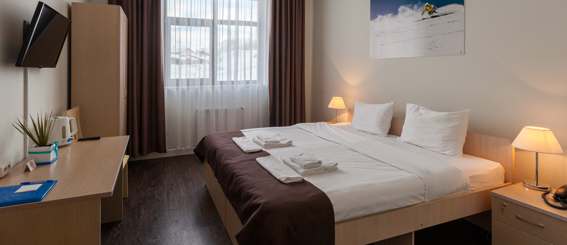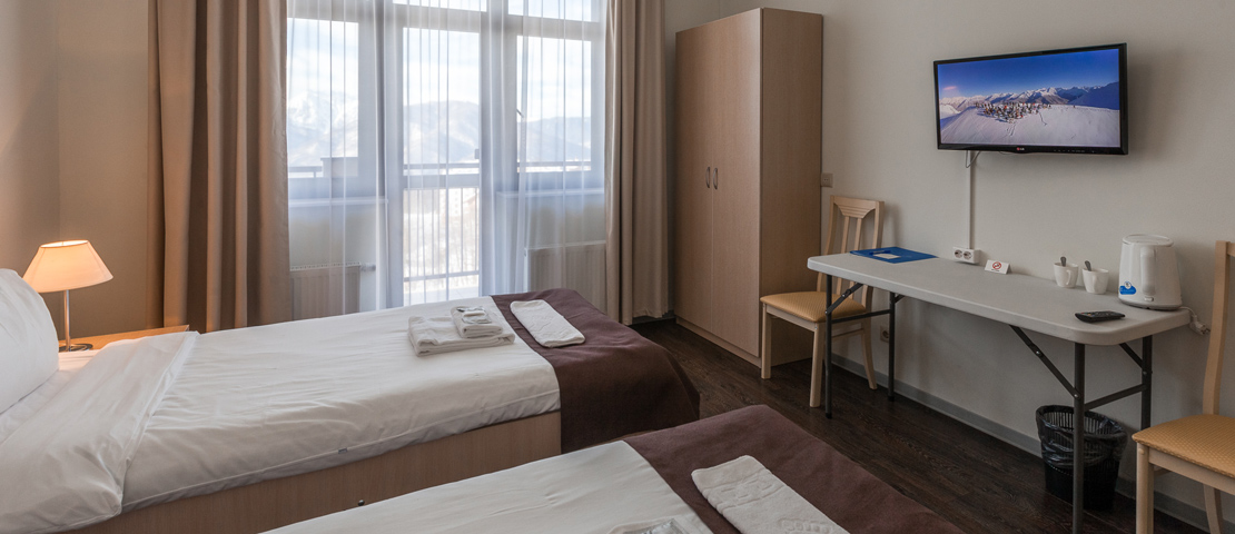 Блок на 2 комнаты имеет общий санузел и душ. Блок на 4 комнаты имеет 2 общих санузла и душа. Площадь 1 комнаты составляет 10-15 кв.м. Хранить лыжи и инвентарь можно в специально предназначенном месте. Есть большой телевизор, телефон, тумбочки, чайник и чайные наборы. Предоставляются полотенца. Есть шкаф. На 1 этаже имеется общая кухня. В номере могут проживать 1 или 2 человека.