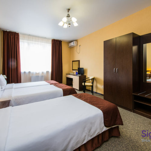 Уютно расположиться позволят 2908 номеров различных планировок. Они размещены в разных корпусах и соединяются между собой аллеями. Внутри каждого есть все необходимое для хорошего отдыха. Можно посмотреть любимый сериал или важный матч на телевизоре. Благодаря бесплатному Wi-Fi вы останетесь на связи с коллегами и домашними. Стильный интерьер в нежных оттенках будет настраивать на качественный отдых. Одно- и двухместные варианты комнат можно выбрать по желанию. При необходимости дополнительно устанавливается еще одно спальное место.