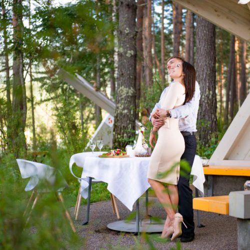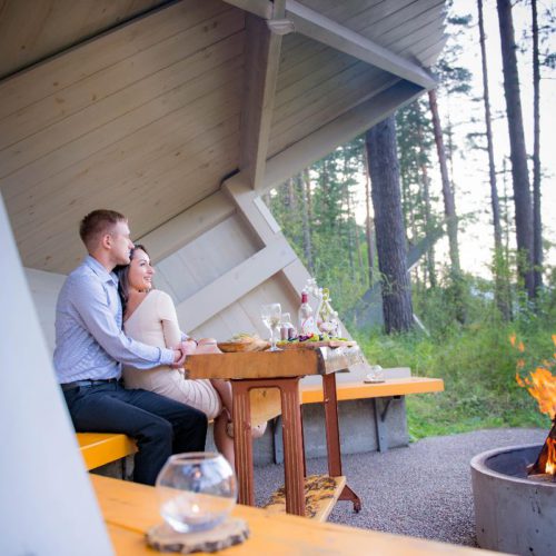 Коттедж идеален для пары, максимальная вместимость — 3 человека. Состоит из спальной комнаты, гостиной с диваном (дополнительное спальное место) и обеденной зоной, ванной. Всесезонная веранда с панорамными окнами отлично подходит для приёма пищи или расслабленного отдыха с видом на лес. В коттедже можно поддерживать комфортную температуру благодаря кондиционеру и климат-контролю. Есть всё необходимое: от холодильника до косметического зеркала.