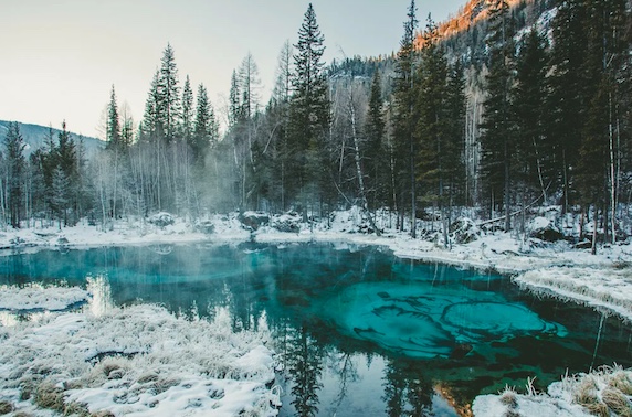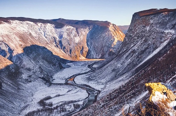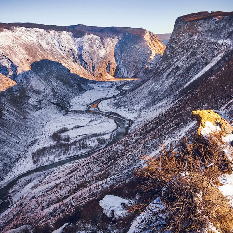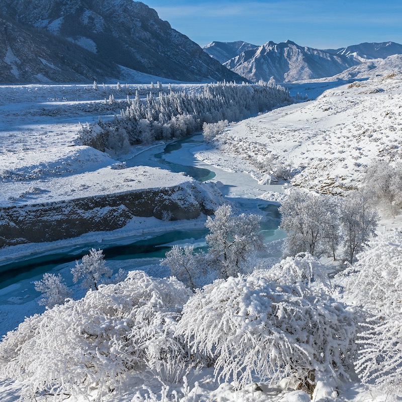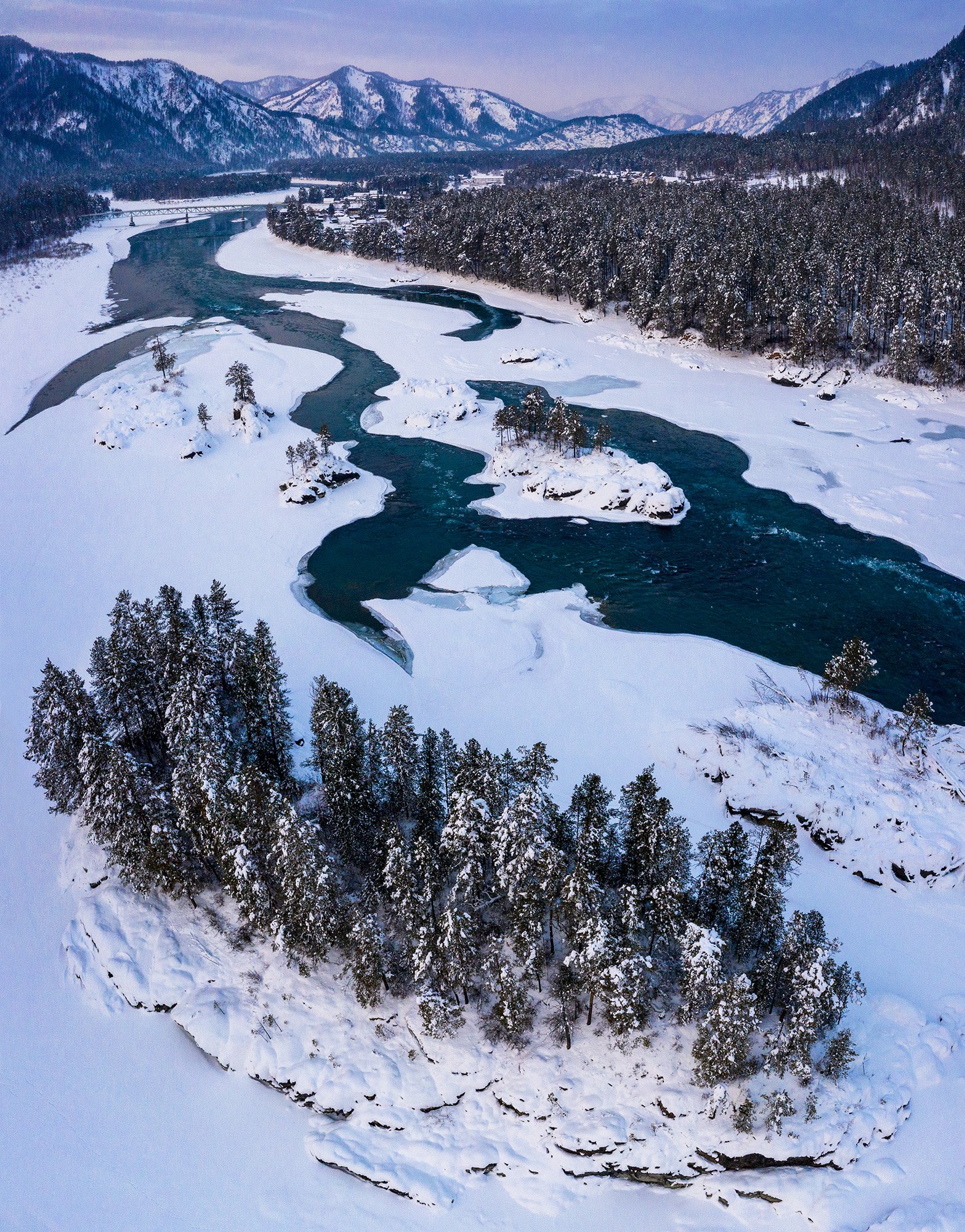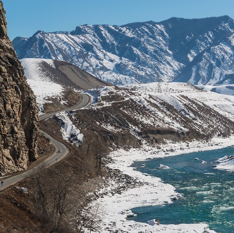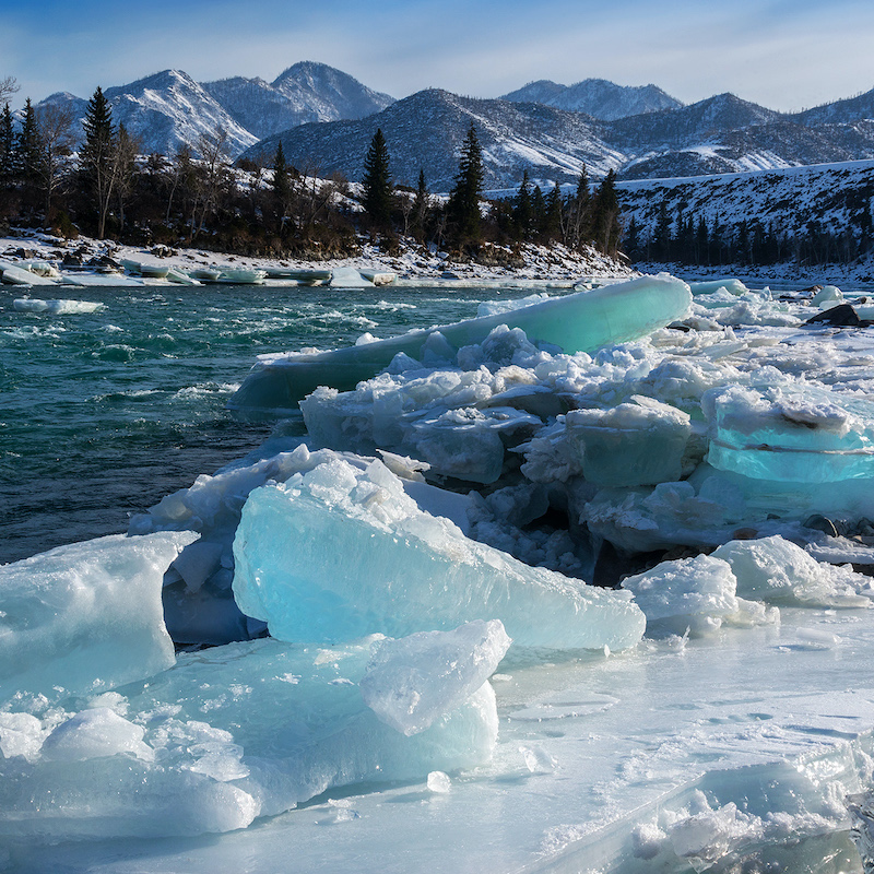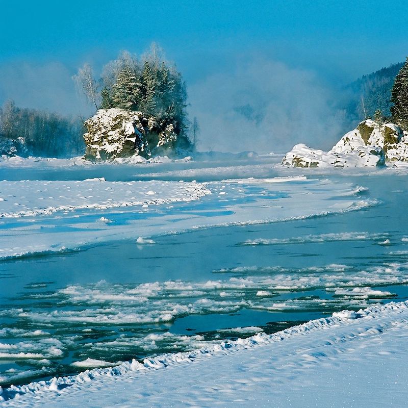 Зимняя Катунь — восхитительное зрелище! Горная река не замерзает целиком, на многих участках она остается открытой и живой, бурлящей. Кипящие пороги среди укрытой снегом и льдом, погрузившейся в спячку природы…. Ослепительно-бирюзовый цвет на фоне белоснежных сугробов… Это точно стоит увидеть!