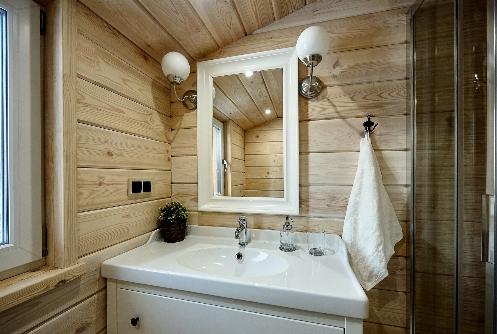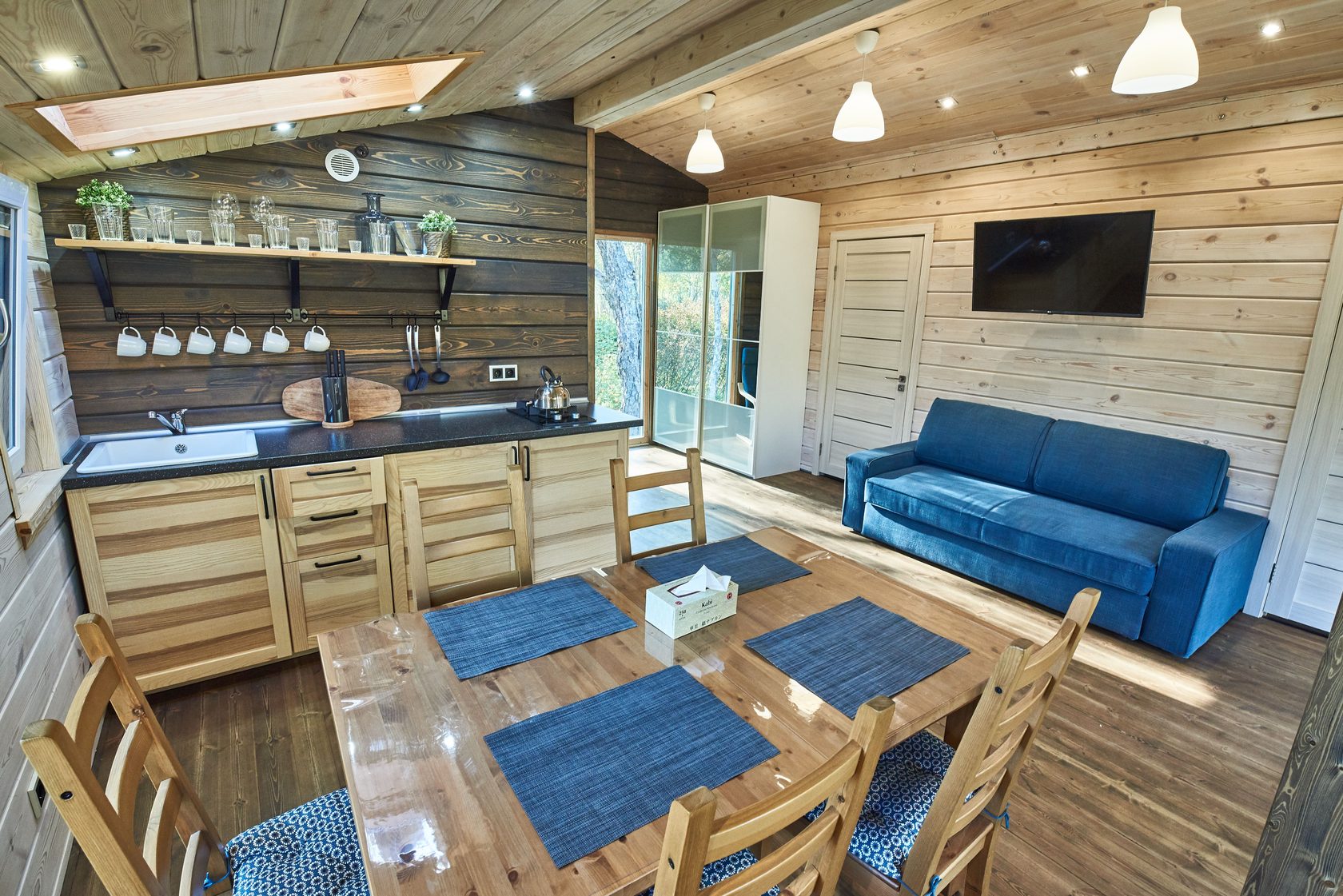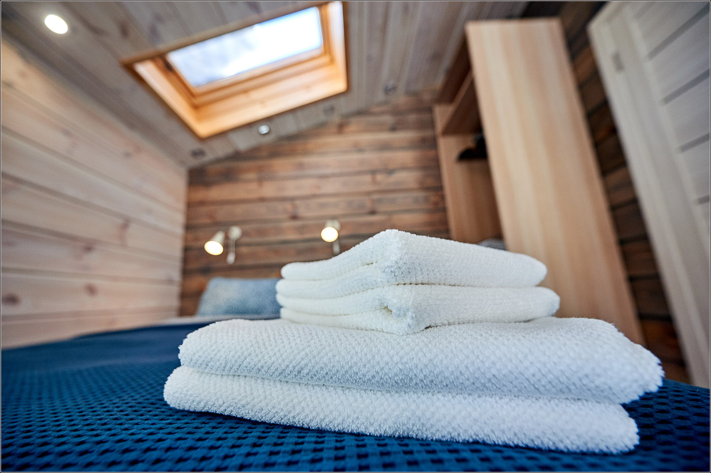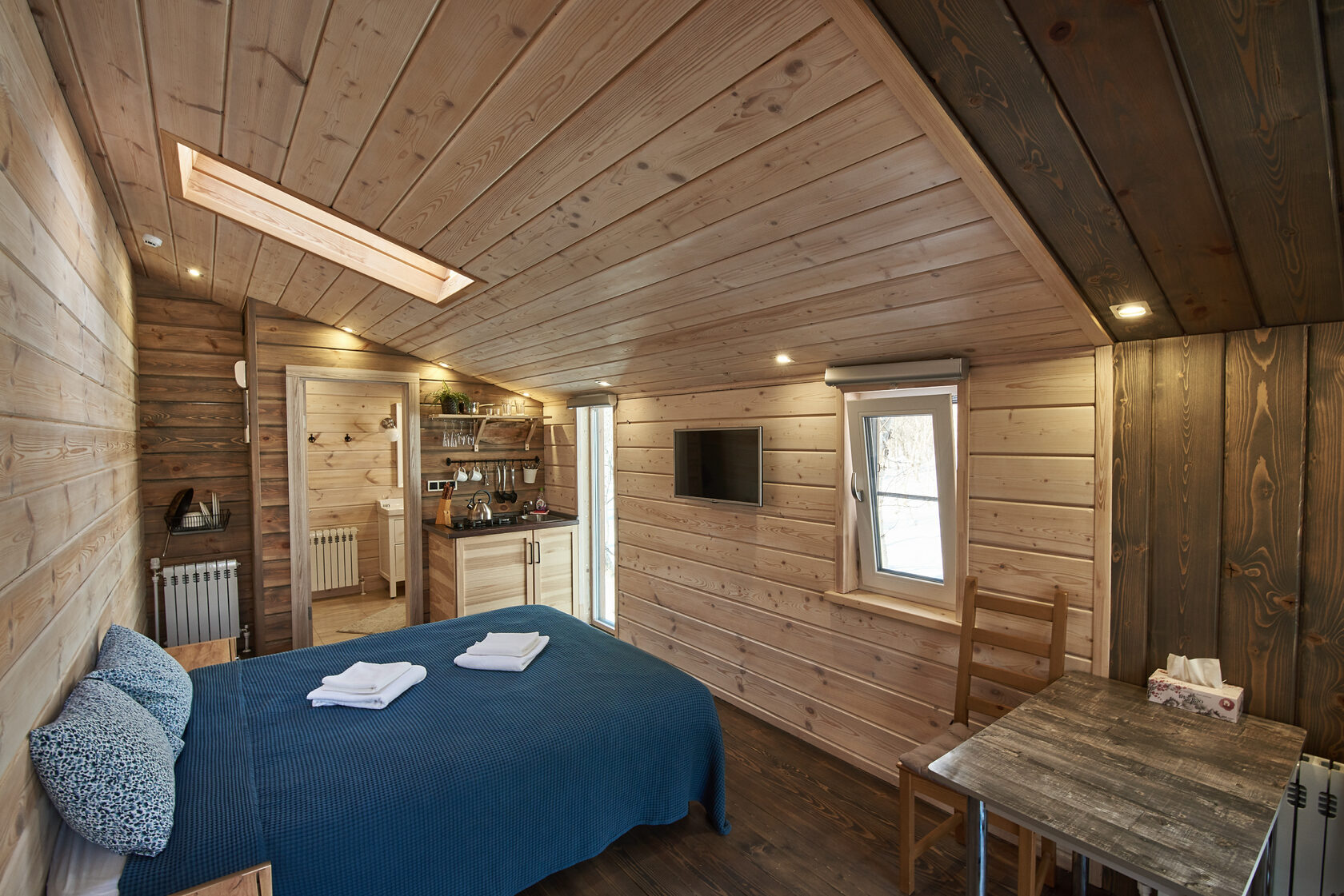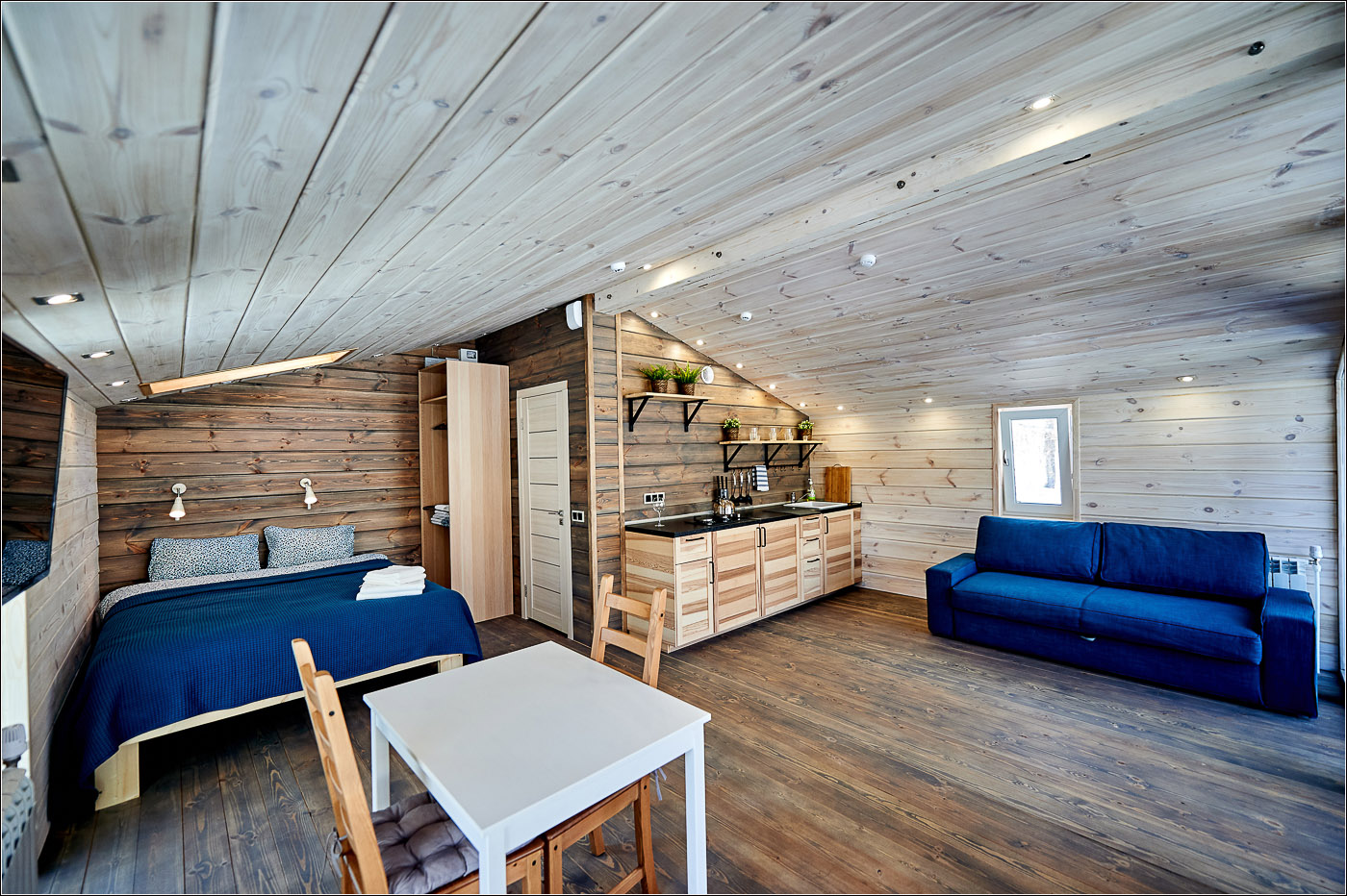 面积 36 平方米,入住人数 - 2-4 人。 开放空间爱好者的住宿。 睡眠区位于壁龛内,与客厅相连。 舒适的双人床上方有一扇阁楼窗户,白天可以看到流动的云彩,晚上可以看到满天的星星。 起居区设有设备齐全的厨房、用餐岛、扶手椅和沙发(可折叠起来容纳 2 张加床)。 浴室配有淋浴、吹风机和卫生用品。 舒适露台上的私人温泉池。