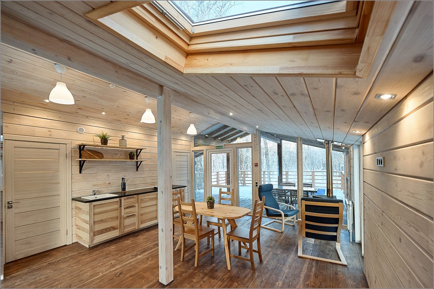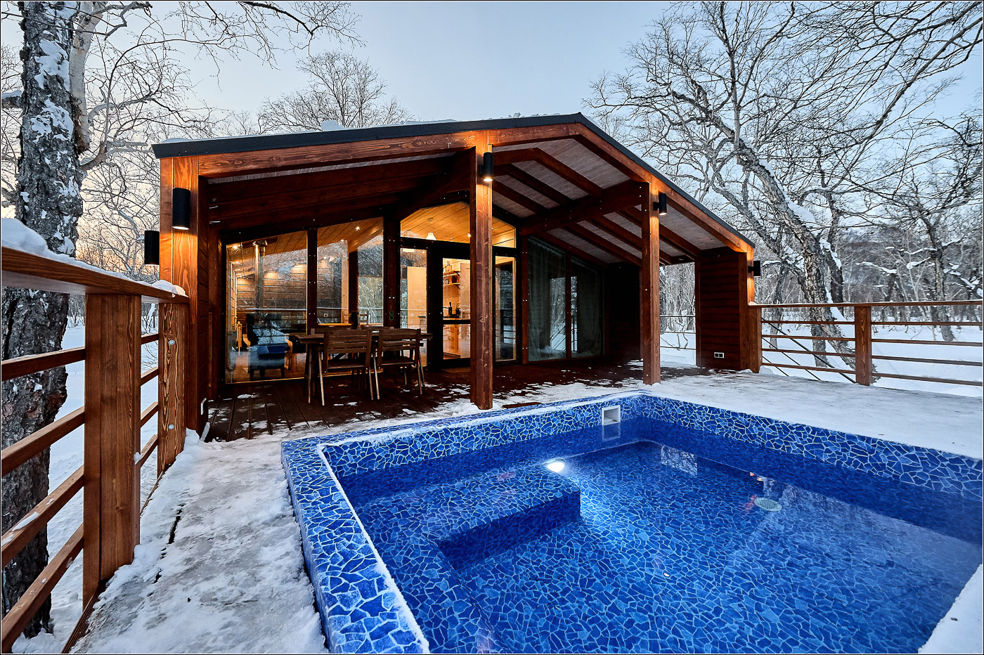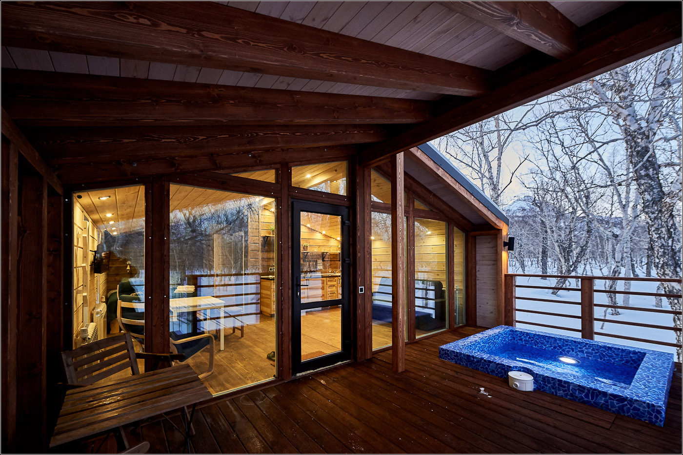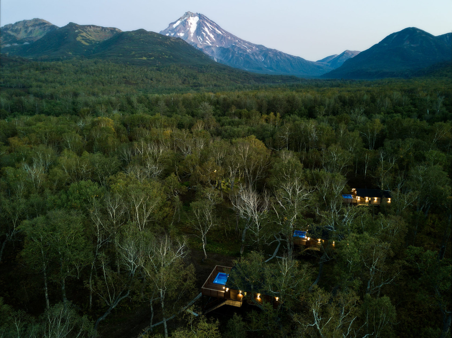 小木屋面积为 45 平方米,最多可容纳 6 位客人。 Forest Lodge所有小木屋的设计基础都是“轻质极简主义”的内饰和功能,这间小木屋也不例外。 天然木材、绿化、带用餐岛的设备齐全的厨房和起居区的软垫家具。 整个房子的全景窗户让您可以欣赏堪察加半岛的自然美景。 大露台有自己的小游泳池和桌椅。