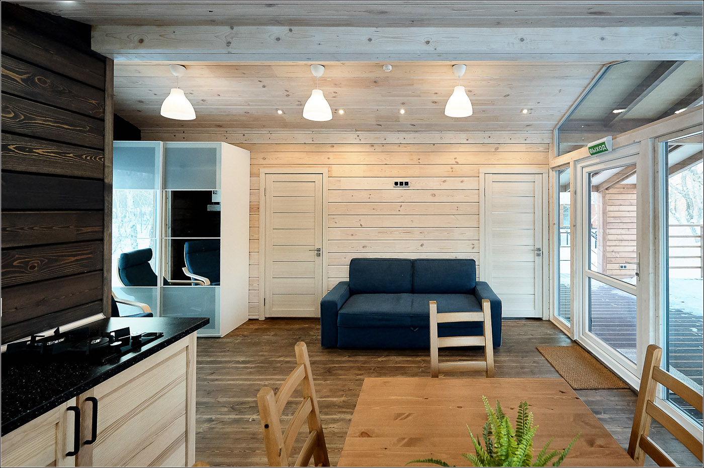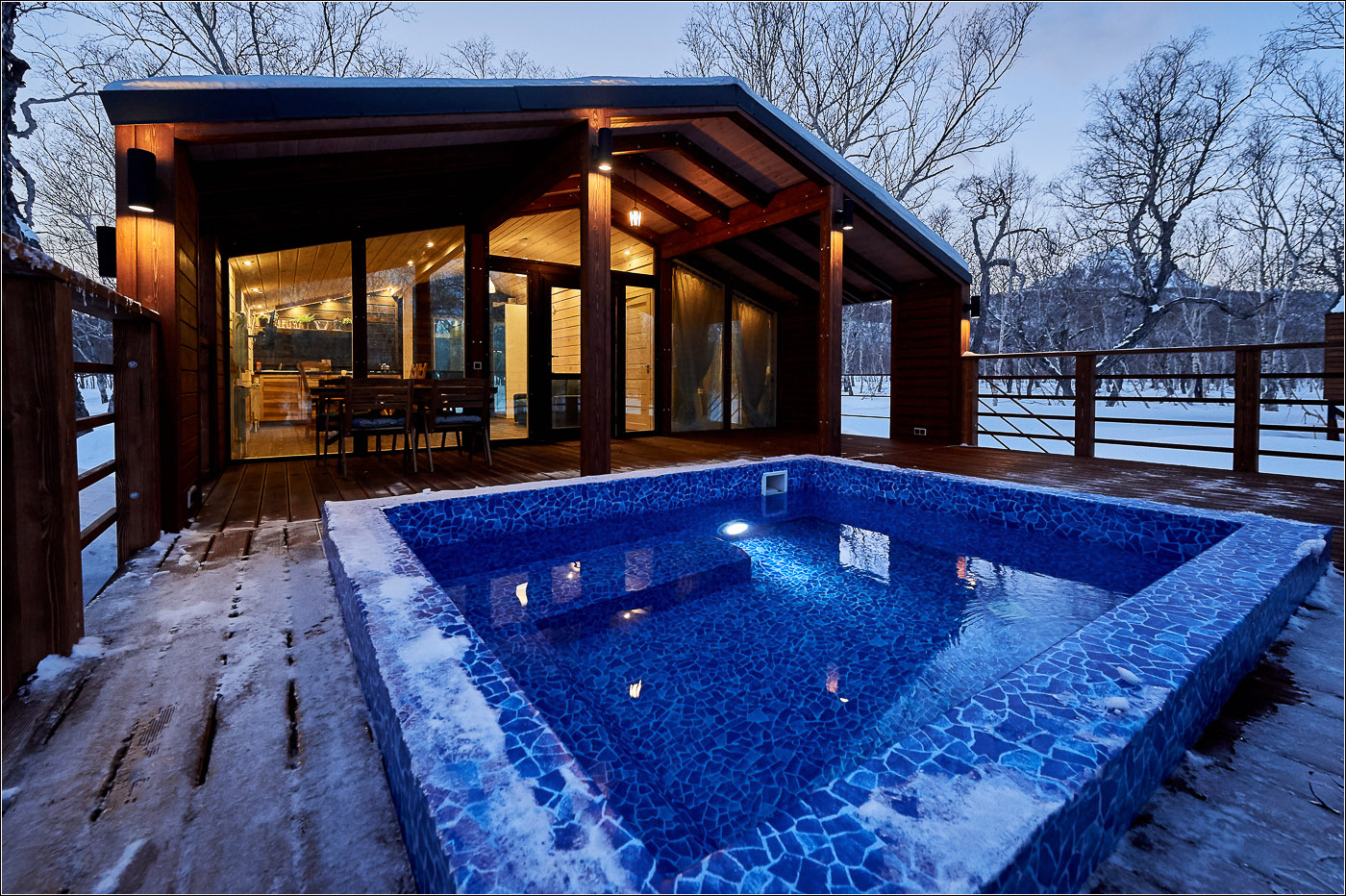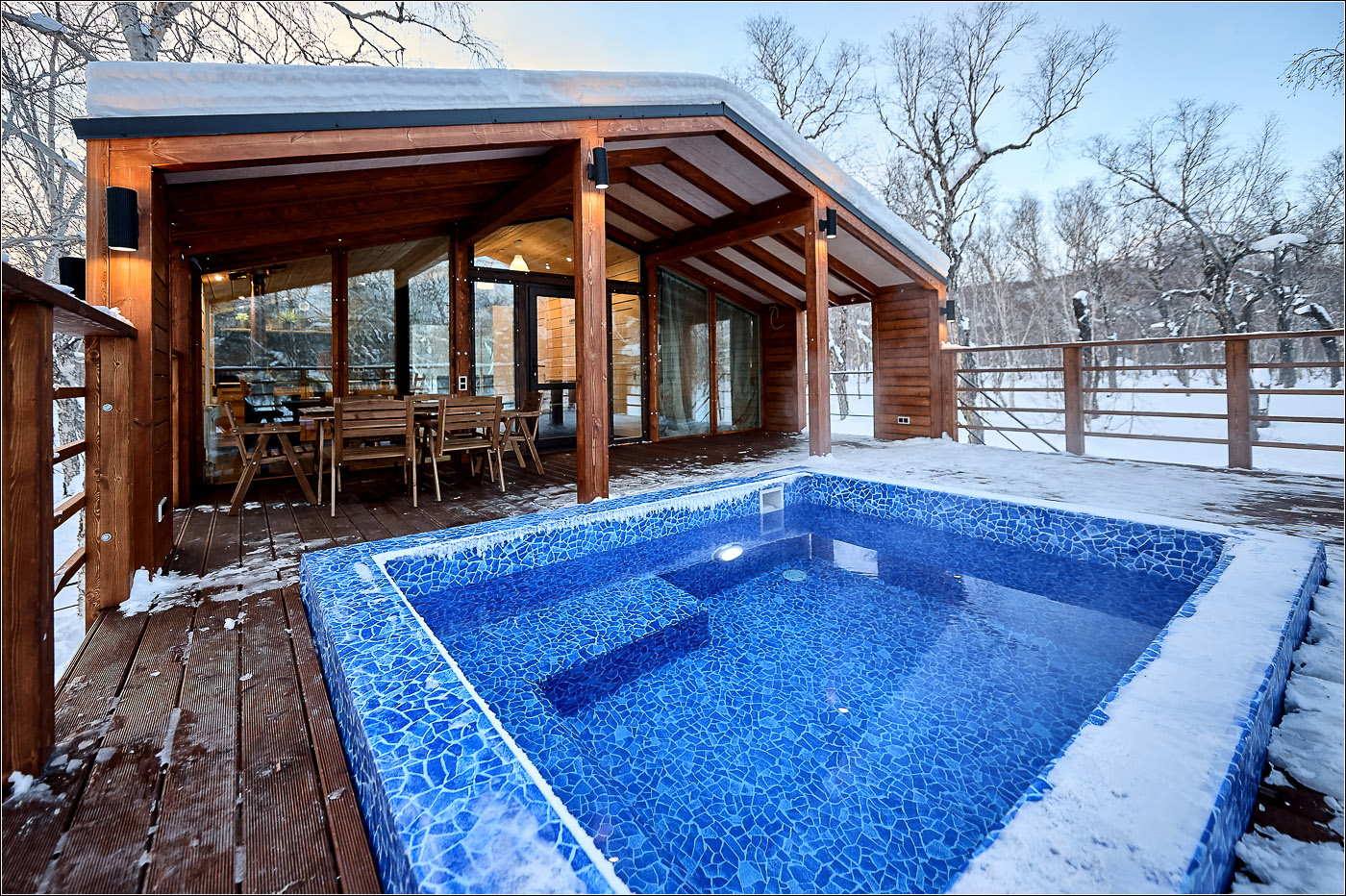小木屋面积为 45 平方米,最多可容纳 6 位客人。 Forest Lodge所有小木屋的设计基础都是“轻质极简主义”的内饰和功能,这间小木屋也不例外。 天然木材、绿化、带用餐岛的设备齐全的厨房和起居区的软垫家具。 整个房子的全景窗户让您可以欣赏堪察加半岛的自然美景。 大露台有自己的小游泳池和桌椅。