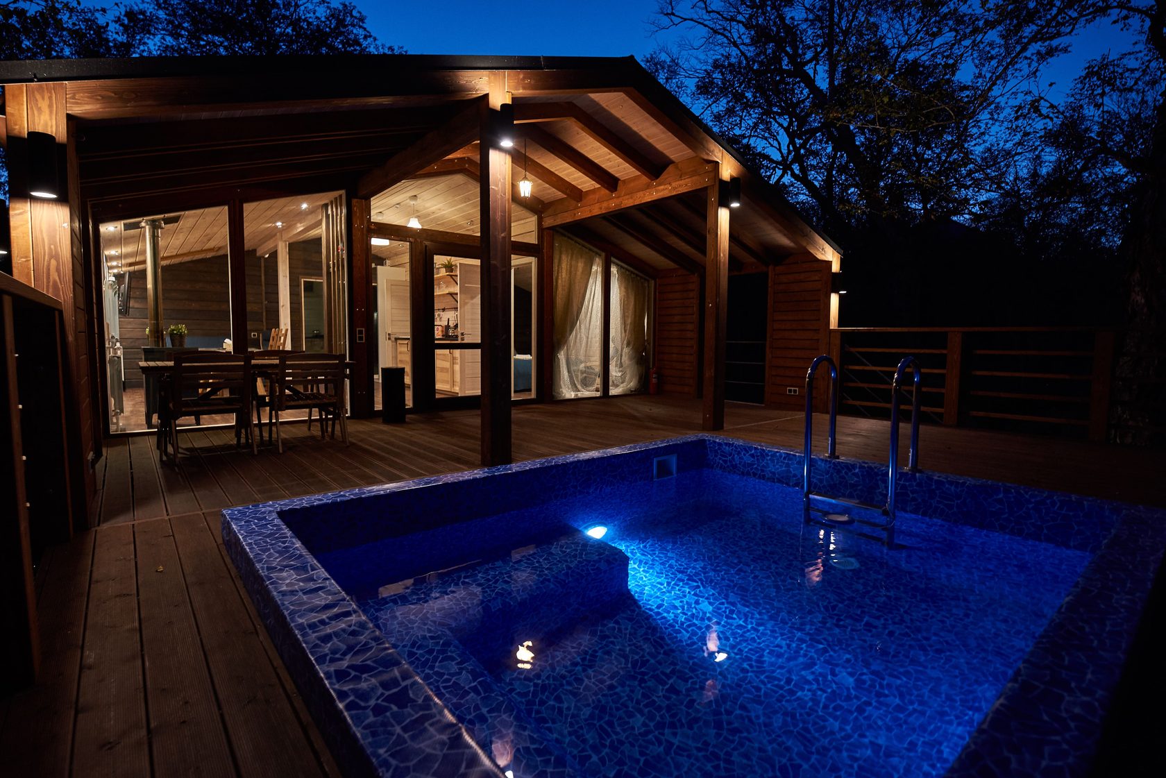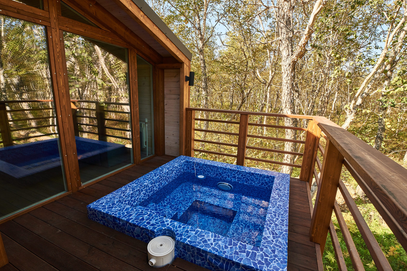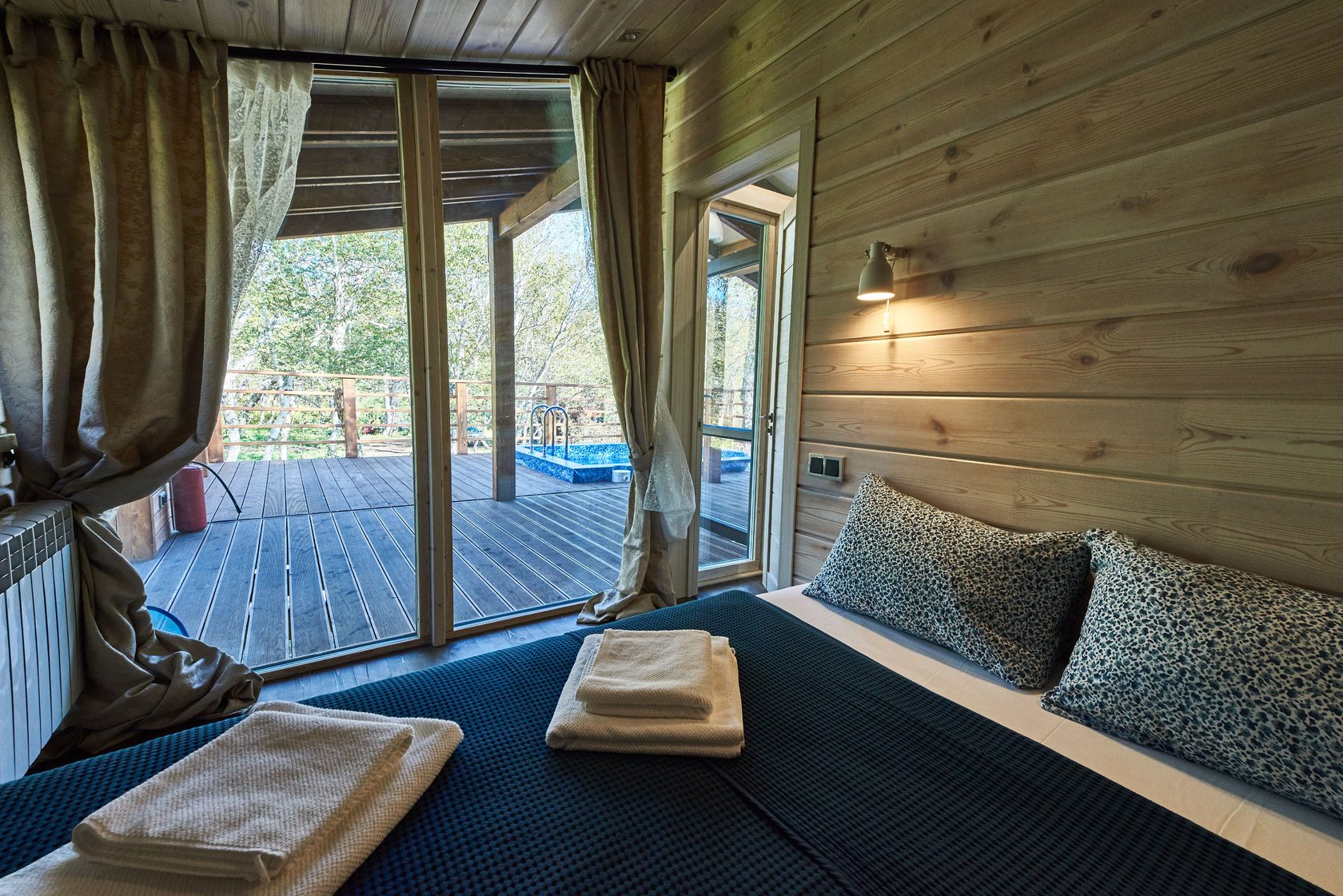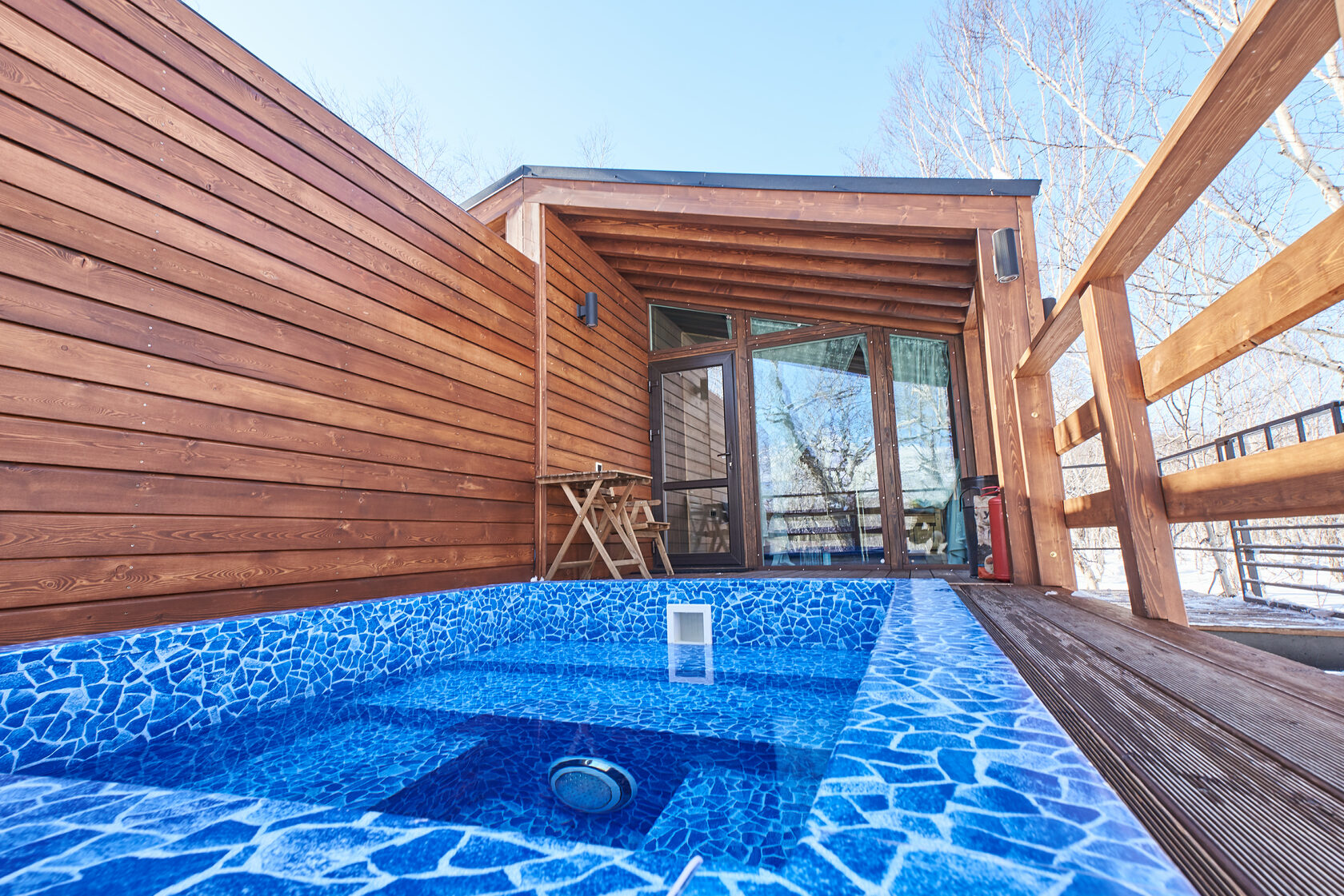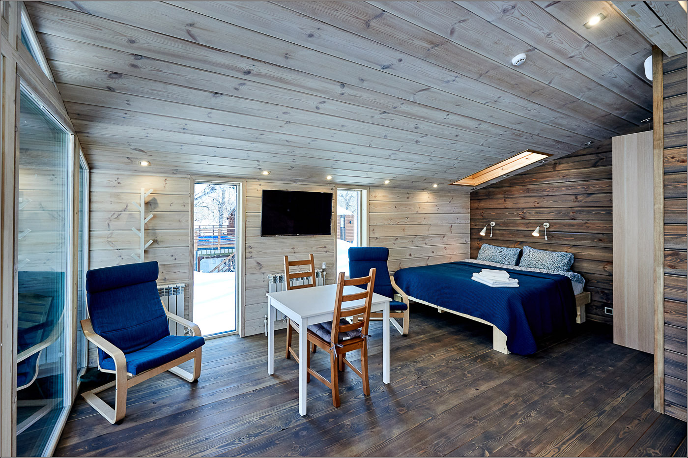 房间位于共用大楼内。 面积 - 20 平方米,床位数量 - 2 张。 客房与 Forest Lodge 酒店的其他所有设施一样,采用斯堪的纳维亚风格装饰:柔和的自然色彩、木质镶板以及别致的全景窗户带来的充足光线。 配有一张双人床,上方有天窗、一间带餐具、冰箱和水壶的小厨房、一台电视、一张带椅子的餐桌以及一间带淋浴的浴室。 舒适的露台上配有供放松的家具和带温泉水的私人游泳池。